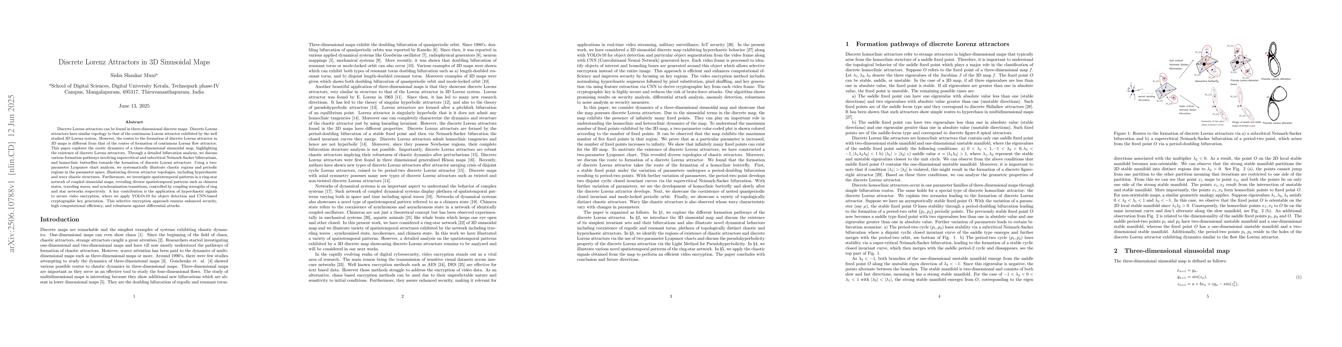 Discrete Lorenz attractors can be found in three-dimensional discrete maps. Discrete Lorenz attractors have similar topology to that of the continuous Lorenz attractor exhibited by the well studied 3D Lorenz system. However, the routes to the formation of discrete Lorenz attractor in 3D maps is different from that of the routes of formation of continuous Lorenz flow attractor. This paper explores the exotic dynamics of a three-dimensional sinusoidal map, highlighting the existence of discrete Lorenz attractors. Through a detailed bifurcation analysis, we discuss various formation pathways involving supercritical and subcritical Neimark-Sacker bifurcations, and homoclinic butterflies towards the formation of discrete Lorenz attractors. Using a two-parameter Lyapunov chart analysis, we systematically illustrate chaotic regions and periodic regions in the parameter space, illustrating diverse attractor topologies, including hyperchaotic and wavy chaotic structures. Furthermore, we investigate spatiotemporal patterns in a ring-star network of coupled sinusoidal maps, revealing diverse spatiotemporal patterns such as chimera states, traveling waves, and synchronization transitions, controlled by coupling strengths of ring and star networks respectively. A key contribution is the application of hyperchaotic signals to secure video encryption, where we apply YOLOv10 for object detection and CNN-based cryptographic key generation. This selective encryption approach ensures enhanced security, high computational efficiency, and robustness against differential attacks.