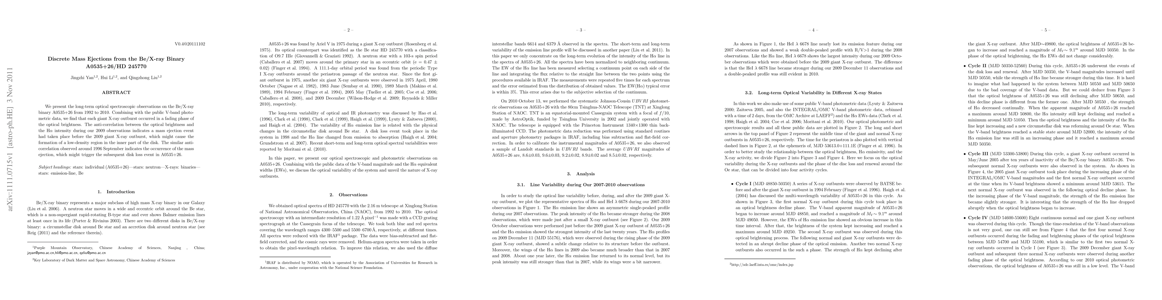 The study of Be/X-ray binary A0535+26 reveals that each giant X-ray outburst occurs during a fading phase of optical brightness, suggesting mass ejection events trigger subsequent disk loss.