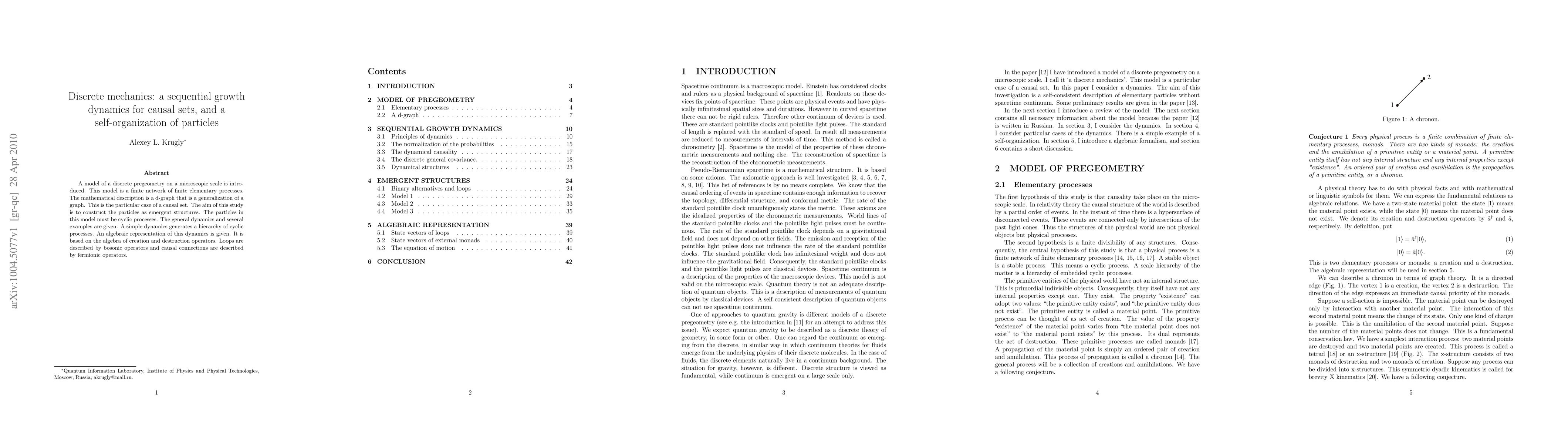 A model of a discrete pregeometry on a microscopic scale is introduced. This model is a finite network of finite elementary processes. The mathematical description is a d-graph that is a generalization of a graph. This is the particular case of a causal set. The aim of this study is to construct the particles as emergent structures. The particles in this model must be cyclic processes. The general dynamics and several examples are given. A simple dynamics generates a hierarchy of cyclic processes. An algebraic representation of this dynamics is given. It is based on the algebra of creation and destruction operators. Loops are described by bosonic operators and causal connections are described by fermionic operators.