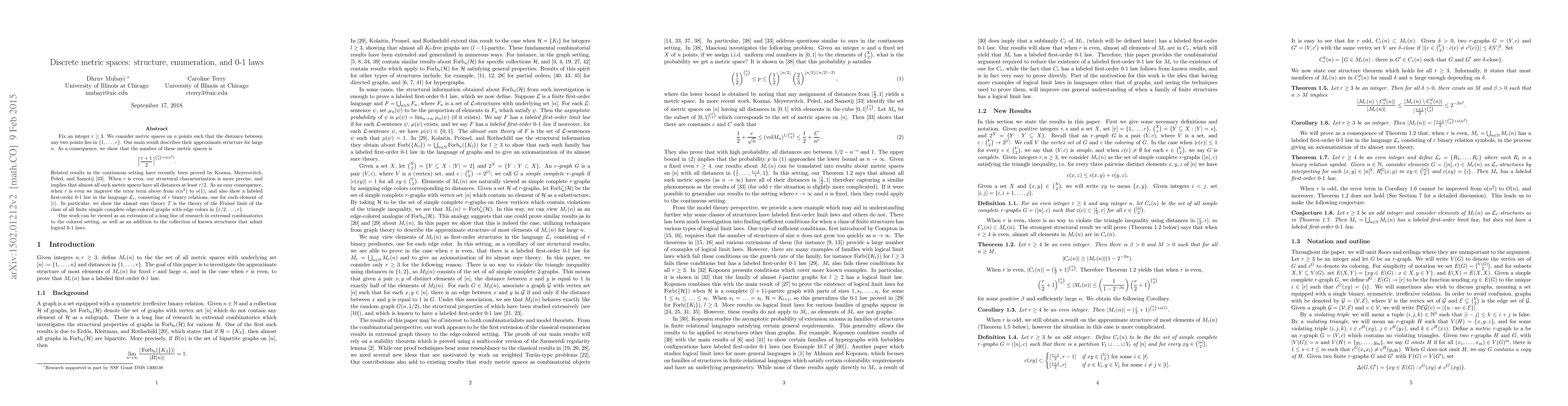 Fix an integer $r\geq 3$. We consider metric spaces on $n$ points such that the distance between any two points lies in $\{1,..., r\}$. Our main result describes their approximate structure for large $n$. As a consequence, we show that the number of these metric spaces is $\lceil \frac{r+1}{2}\rceil ^{{n\choose 2} + o(n^2)}$. Related results in the continuous setting have recently been proved by Kozma, Meyerovitch, Peled, and Samotij. When $r$ is even, our structural characterization is more precise, and implies that almost all such metric spaces have all distances at least $r/2$. As an easy consequence, when $r$ is even we improve the error term above from $o(n^2)$ to $o(1)$, and also show a labeled first-order $0$-$1$ law in the language $\mathcal{L}_r$, consisting of $r$ binary relations, one for each element of $[r]$. In particular, we show the almost sure theory $T$ is the theory of the Fra\"{i}ss\'{e} limit of the class of all finite simple complete edge-colored graphs with edge colors in $\{r/2,..., r\}$. Our work can be viewed as an extension of a long line of research in extremal combinatorics to the colored setting, as well as an addition to the collection of known structures that admit logical $0$-$1$ laws.