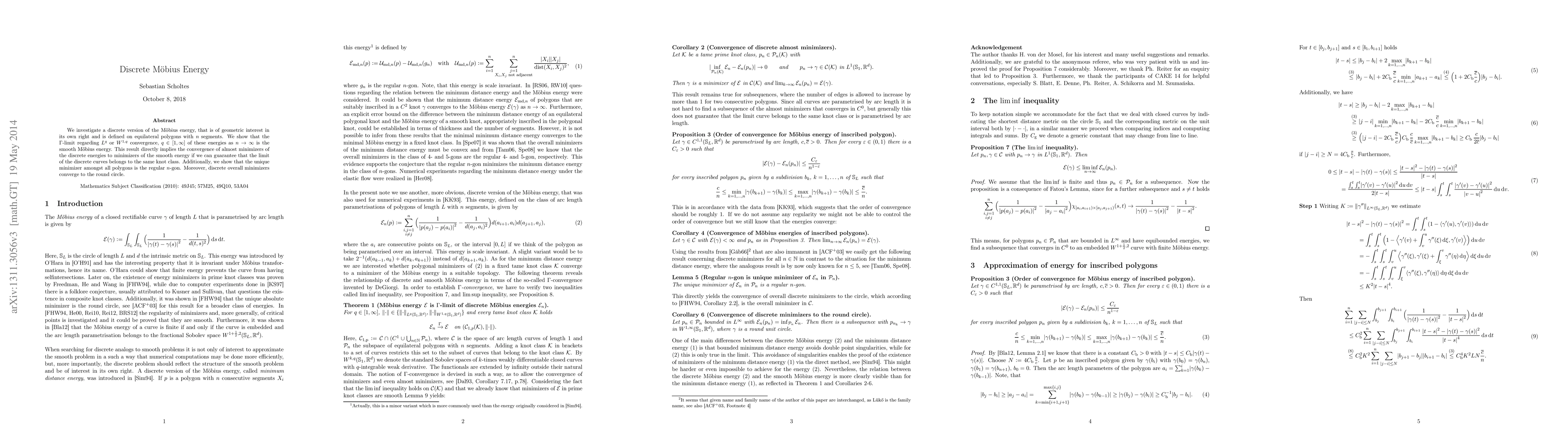 Researchers investigate a discrete version of M"obius energy on equilateral polygons with n segments, showing it converges to the smooth M"obius energy as n approaches infinity.