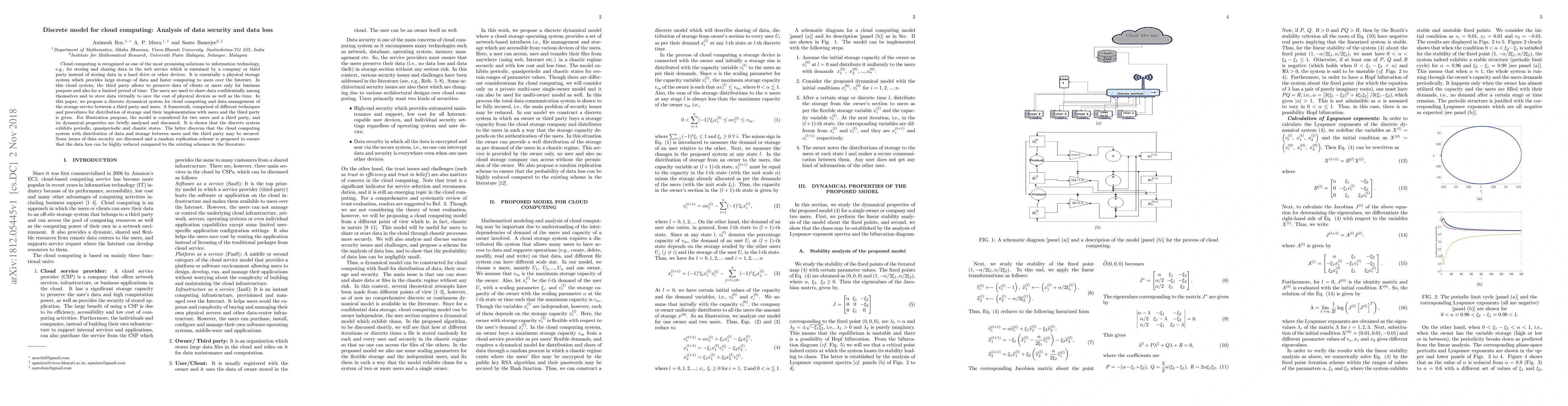 This paper introduces a discrete dynamical system model for cloud computing data management, involving users and a third party. The model demonstrates periodic, quasiperiodic, and chaotic states, suggesting secure data distribution. A random replication scheme is proposed to minimize data loss.