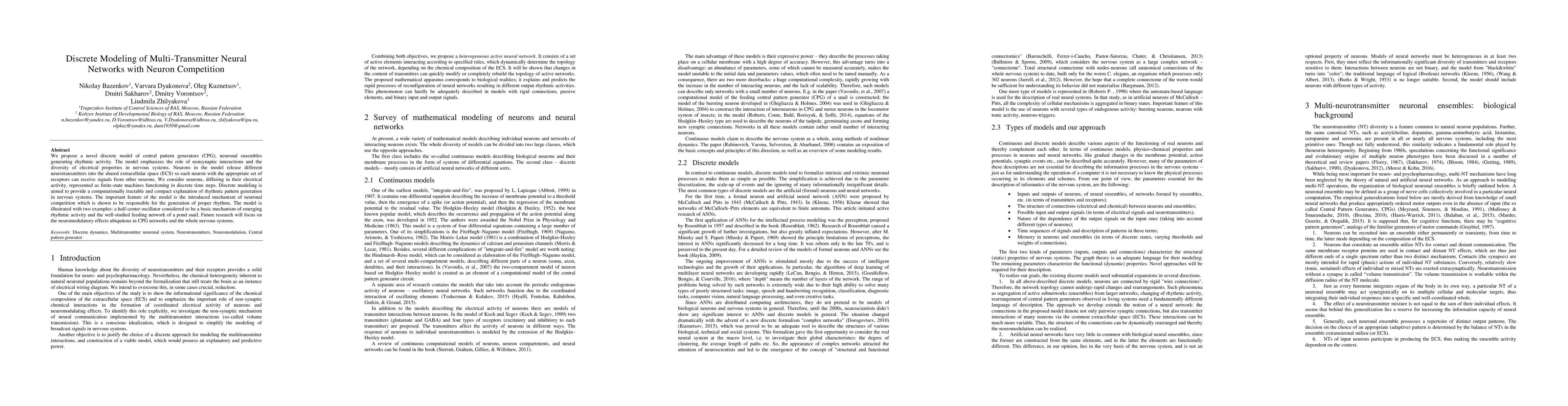 We propose a novel discrete model of central pattern generators (CPG), neuronal ensembles generating rhythmic activity. The model emphasizes the role of nonsynaptic interactions and the diversity of electrical properties in nervous systems. Neurons in the model release different neurotransmitters into the shared extracellular space (ECS) so each neuron with the appropriate set of receptors can receive signals from other neurons. We consider neurons, differing in their electrical activity, represented as finite-state machines functioning in discrete time steps. Discrete modeling is aimed to provide a computationally tractable and compact explanation of rhythmic pattern generation in nervous systems. The important feature of the model is the introduced mechanism of neuronal competition which is shown to be responsible for the generation of proper rhythms. The model is illustrated with two examples: a half-center oscillator considered to be a basic mechanism of emerging rhythmic activity and the well-studied feeding network of a pond snail. Future research will focus on the neuromodulatory effects ubiquitous in CPG networks and the whole nervous systems.