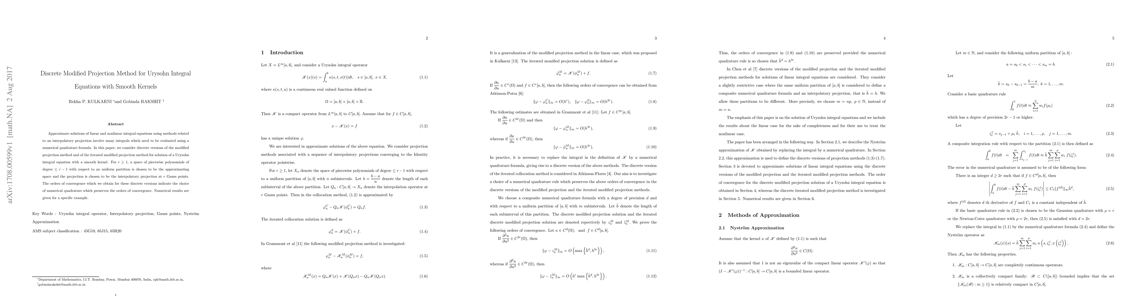 This paper proposes discrete versions of the modified projection method for solving Urysohn integral equations with smooth kernels, using piecewise polynomials and Gauss quadrature for numerical integration. The study shows that the chosen quadrature preserves convergence orders, with numerical results demonstrating the method's effectiveness.