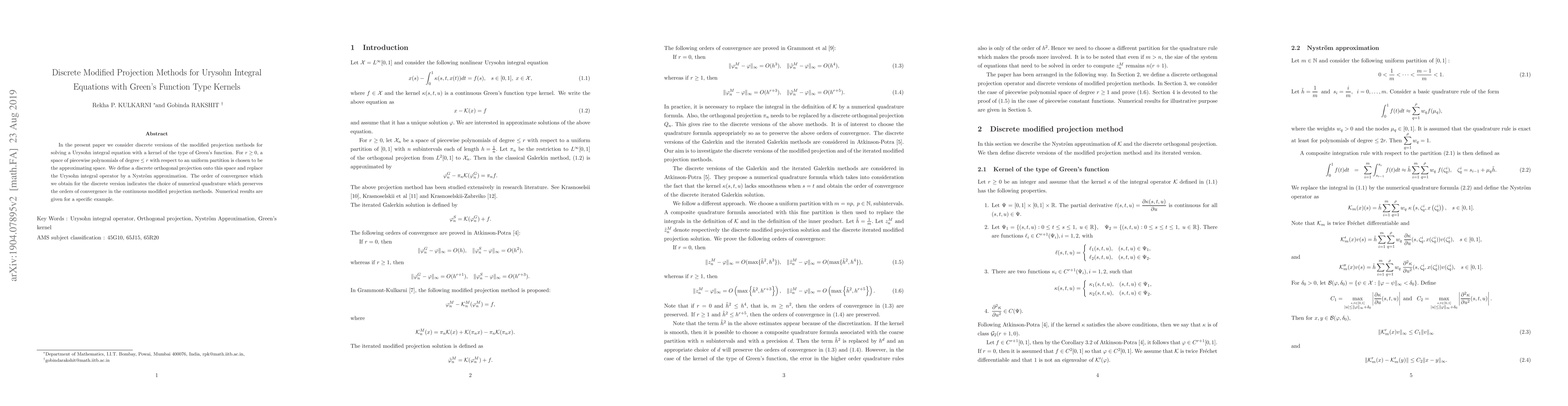 This paper develops discrete modified projection methods for solving Urysohn integral equations with Green's function kernels, using piecewise polynomials for approximation. The method employs a Nyström approximation and demonstrates convergence order, validated through numerical results for a specific example.