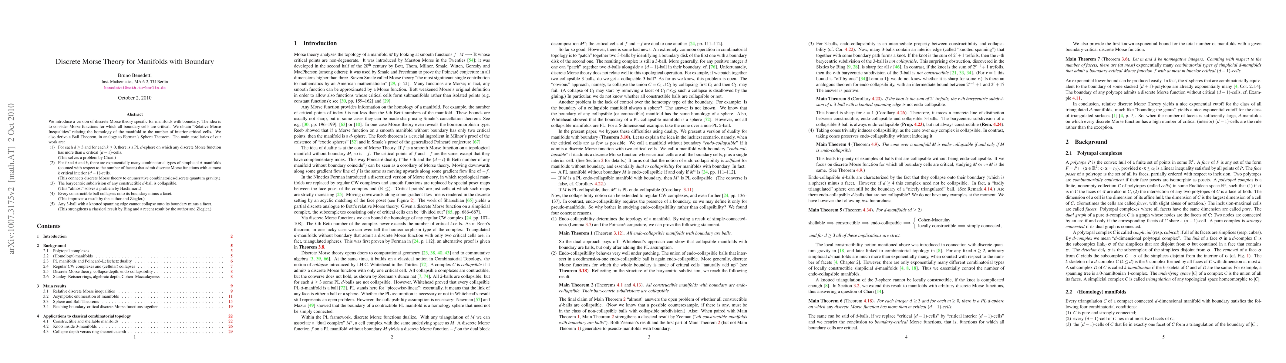 This paper extends discrete Morse theory to manifolds with boundary, establishing relative Morse inequalities and deriving a Ball Theorem. It demonstrates applications in solving problems related to the number of critical cells on PL spheres, enumerating simplicial d-manifolds, proving the collapsibility of barycentric subdivisions, and providing insights into knotted 3-balls.