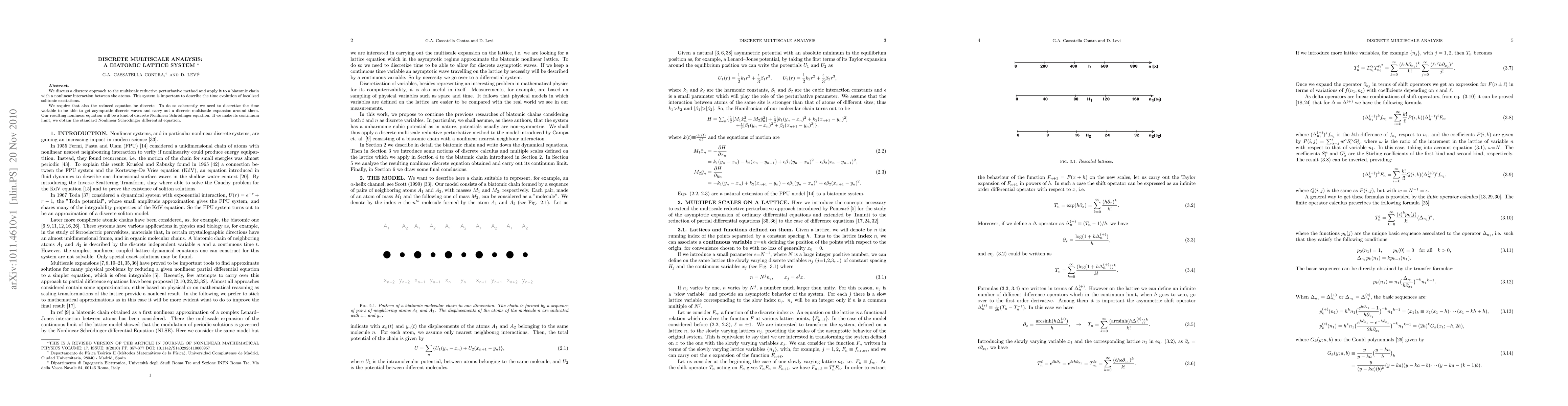 We discuss a discrete approach to the multiscale reductive perturbative method and apply it to a biatomic chain with a nonlinear interaction between the atoms. This system is important to describe the time evolution of localized solitonic excitations. We require that also the reduced equation be discrete. To do so coherently we need to discretize the time variable to be able to get asymptotic discrete waves and carry out a discrete multiscale expansion around them. Our resulting nonlinear equation will be a kind of discrete Nonlinear Schr\"odinger equation. If we make its continuum limit, we obtain the standard Nonlinear Schr\"odinger differential equation.