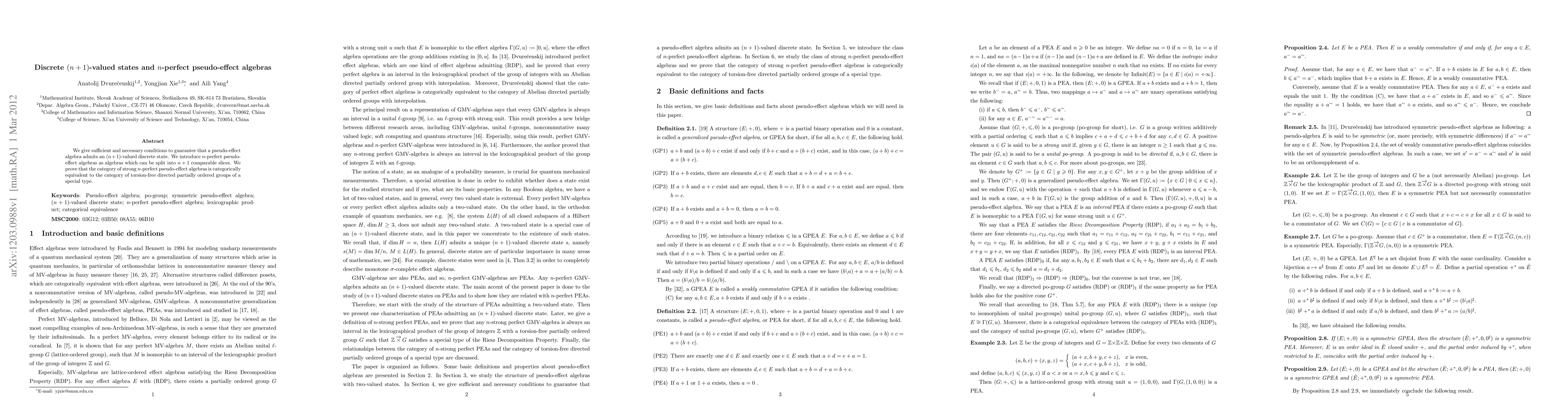 Summary: The paper presents conditions for pseudo-effect algebras to support $(n+1)$-valued discrete states and defines $n$-perfect pseudo-effect algebras, showing their categorical equivalence to torsion-free directed partially ordered groups of a specific type.