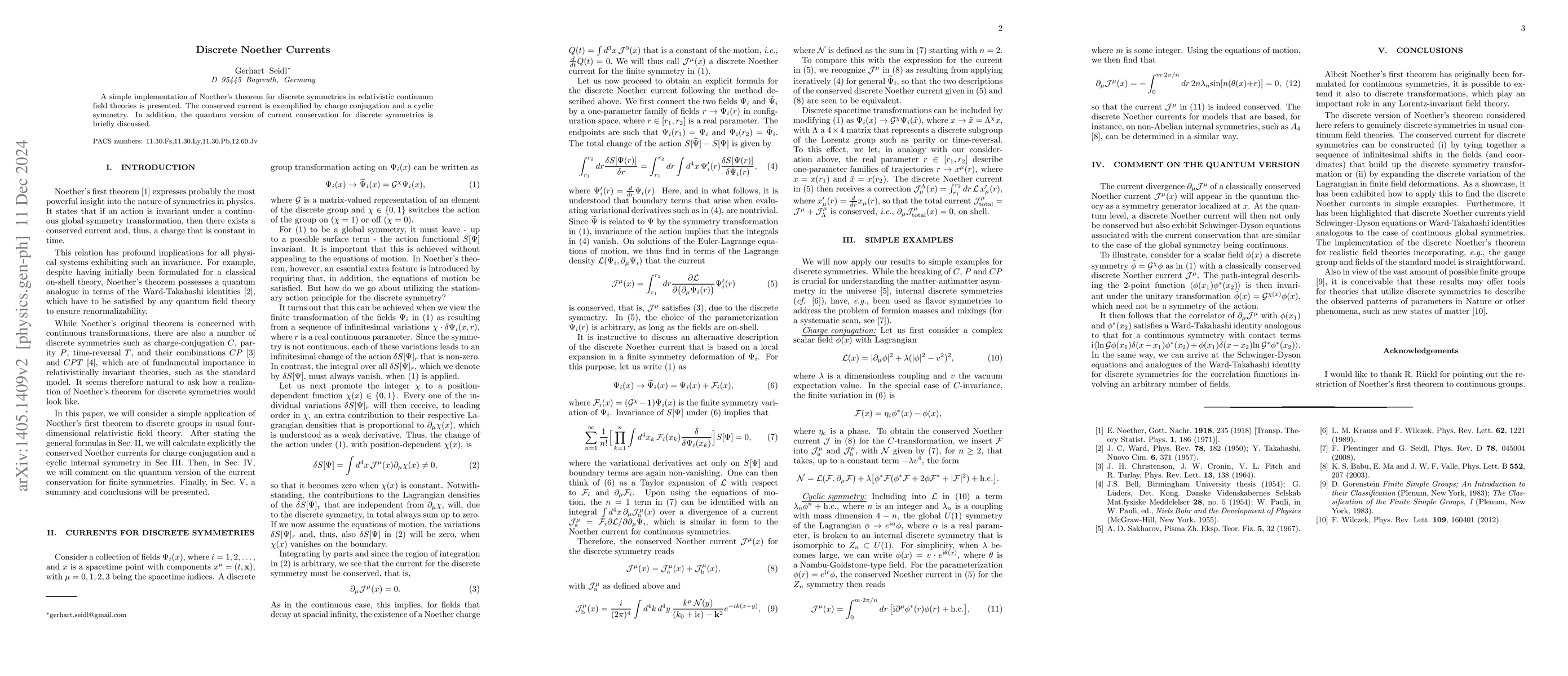 This paper generalizes Noether's theorem to discrete symmetries in relativistic field theories, deriving conserved currents for various discrete spacetime and internal symmetries and establishing a Ward-Takahashi identity for these currents.