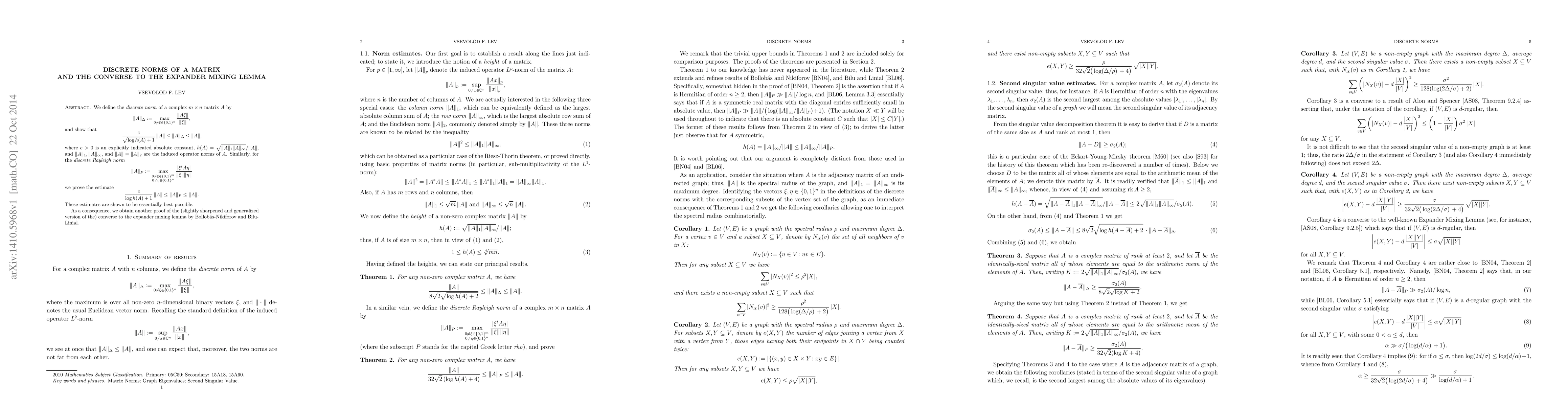 We define the discrete norm of a complex $m\times n$ matrix $A$ by $$ \|A\|_\Delta := \max_{0\ne\xi\in\{0,1\}^n} \frac{\|A\xi\|}{\|\xi\|}, $$ and show that $$ \frac c{\sqrt{\log h(A)+1}}\,\|A\| \le \|A\|_\Delta \le \|A\|, $$ where $c>0$ is an explicitly indicated absolute constant, $h(A)=\sqrt{\|A\|_1\|A\|_\infty}/\|A\|$, and $\|A\|_1,\|A\|_\infty$, and $\|A\|=\|A\|_2$ are the induced operator norms of $A$. Similarly, for the \emph{discrete Rayleigh norm} $$ \|A\|_P := \max_{\substack{0\ne\xi\in\{0,1\}^m \\ 0\ne\eta\in\{0,1\}^n}} \frac{|\xi^tA\eta|}{\|\xi\|\|\eta\|} $$ we prove the estimate $$ \frac c{\log h(A)+1}\,\|A\| \le \|A\|_P \le \|A\|. $$ These estimates are shown to be essentially best possible. As a consequence, we obtain another proof of the (slightly sharpened and generalized version of the) converse to the expander mixing lemma by Bollobas-Nikiforov and Bilu-Linial.