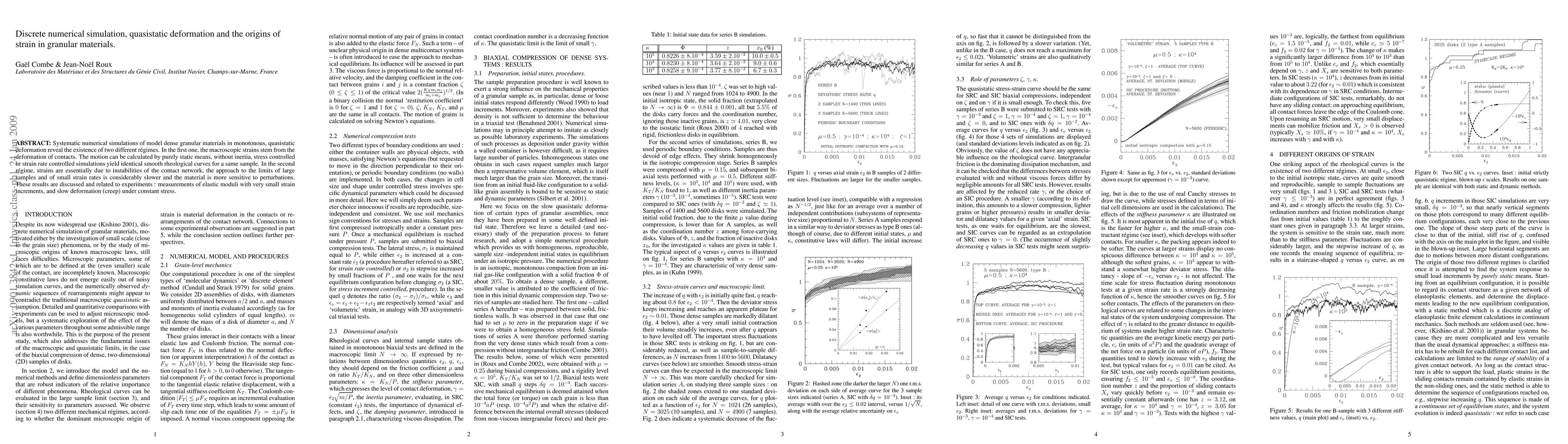 Systematic numerical simulations of model dense granular materials in monotonous, quasistatic deformation reveal the existence of two different r\'egimes. In the first one, the macroscopic strains stem from the deformation of contacts. The motion can be calculated by purely static means, without inertia, stress controlled or strain rate controlled simulations yield identical smooth rheological curves for a same sample. In the second r\'egime, strains are essentially due to instabilities of the contact network, the approach to the limits of large samples and of small strain rates is considerably slower and the material is more sensitive to perturbations. These results are discussed and related to experiments : measurements of elastic moduli with very small strain increments, and slow deformation (creep) under constant stress.