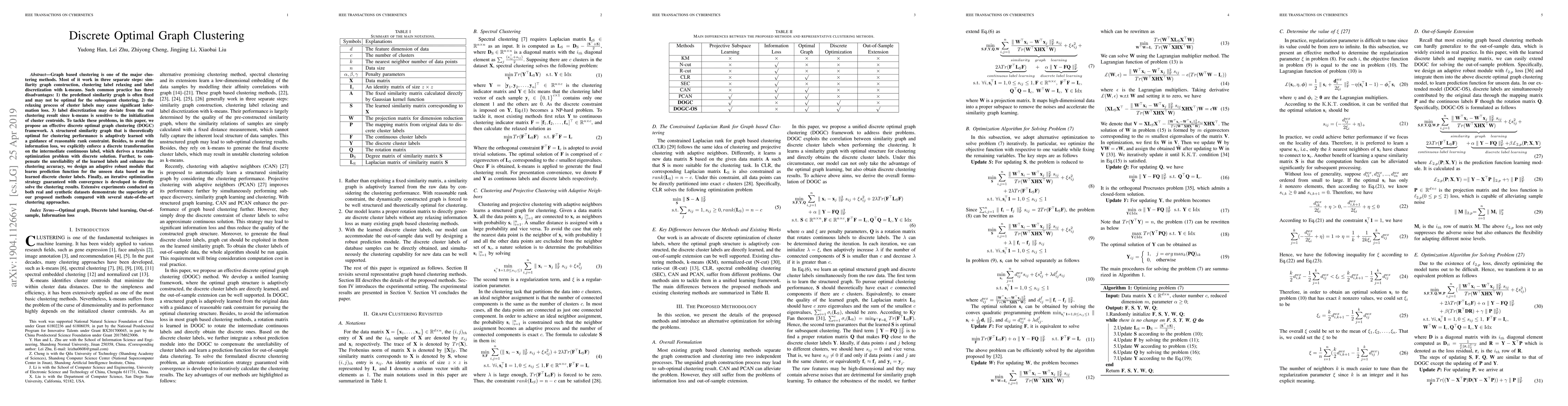 This paper proposes a Discrete Optimal Graph Clustering (DOGC) framework to address issues in traditional graph clustering methods, including suboptimal similarity graphs, information loss, and sensitivity to initialization. The DOGC framework adaptively learns an optimal similarity graph, enforces a discrete transformation to avoid information loss, and includes an adaptive robust module to enhance accuracy, ultimately achieving superior clustering performance.