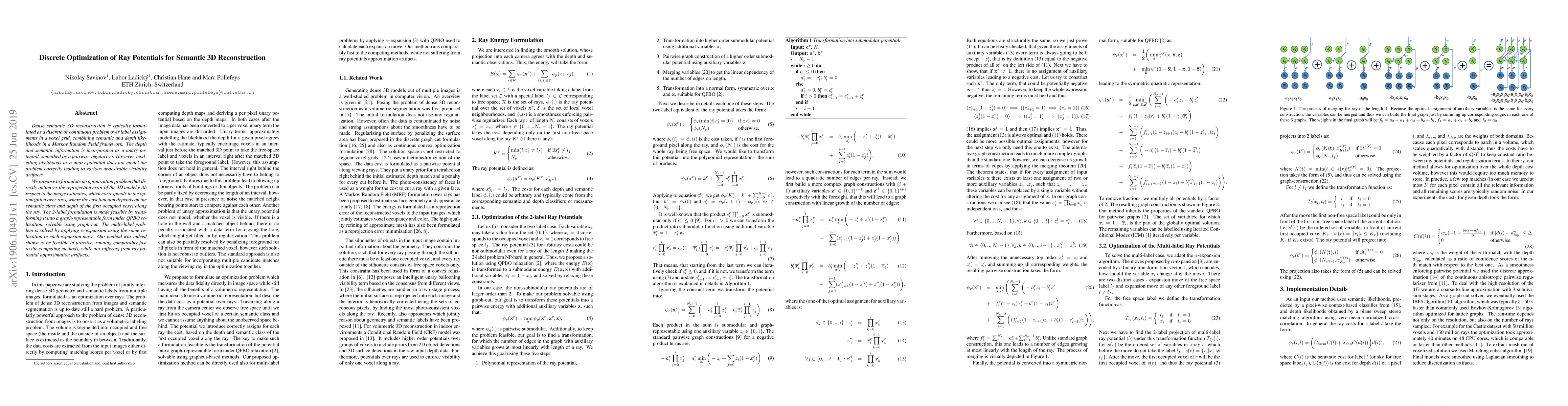 Dense semantic 3D reconstruction is typically formulated as a discrete or continuous problem over label assignments in a voxel grid, combining semantic and depth likelihoods in a Markov Random Field framework. The depth and semantic information is incorporated as a unary potential, smoothed by a pairwise regularizer. However, modelling likelihoods as a unary potential does not model the problem correctly leading to various undesirable visibility artifacts. We propose to formulate an optimization problem that directly optimizes the reprojection error of the 3D model with respect to the image estimates, which corresponds to the optimization over rays, where the cost function depends on the semantic class and depth of the first occupied voxel along the ray. The 2-label formulation is made feasible by transforming it into a graph-representable form under QPBO relaxation, solvable using graph cut. The multi-label problem is solved by applying alpha-expansion using the same relaxation in each expansion move. Our method was indeed shown to be feasible in practice, running comparably fast to the competing methods, while not suffering from ray potential approximation artifacts.