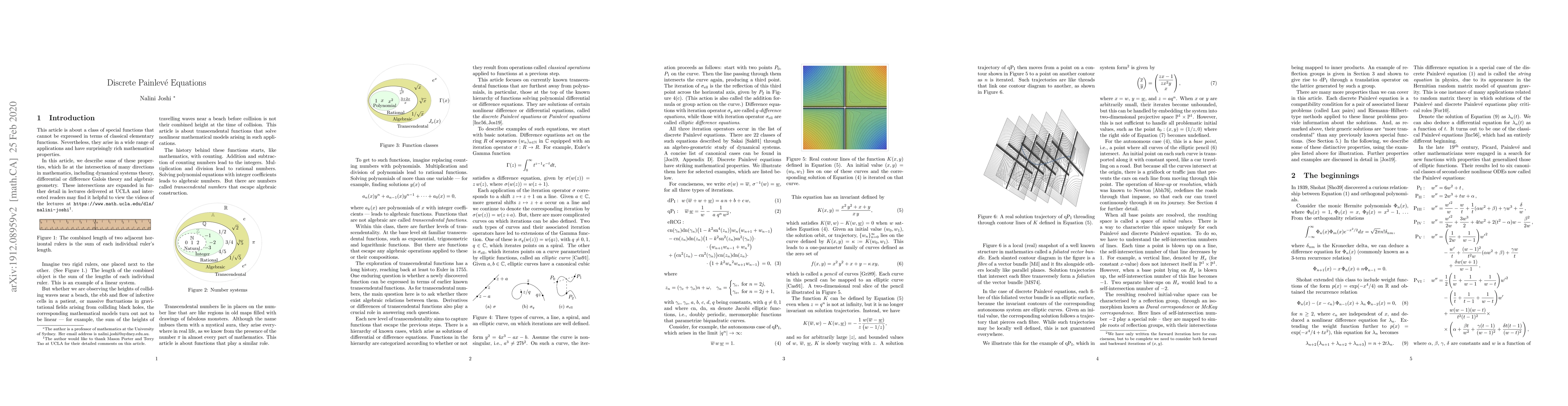 This expository article written for the Notices of the American Mathematical Society provides an overview of transcendental functions arising as solutions of the discrete Painlev\'e equations, for which the developments of the last two decades have been rich and dynamic. These equations arise at the center of many viewpoints: random matrix theory, algebra, algebraic geometry, dynamical systems and the theory of transcendental functions. The purpose of this article is to reveal this confluence and modern perspectives on it.