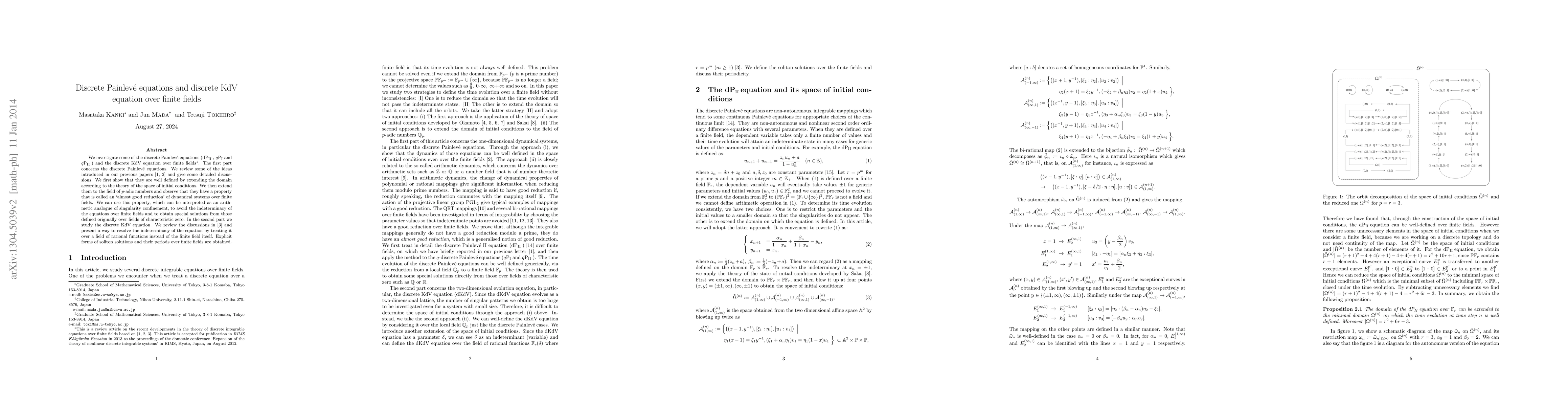 This paper reviews recent developments in discrete Painlevé equations (dPII, qPI, and qPII) and the discrete KdV equation over finite fields, demonstrating their "almost good reduction" and resolving indeterminacies by treating them over fields of rational functions. Special solutions and soliton forms are derived.