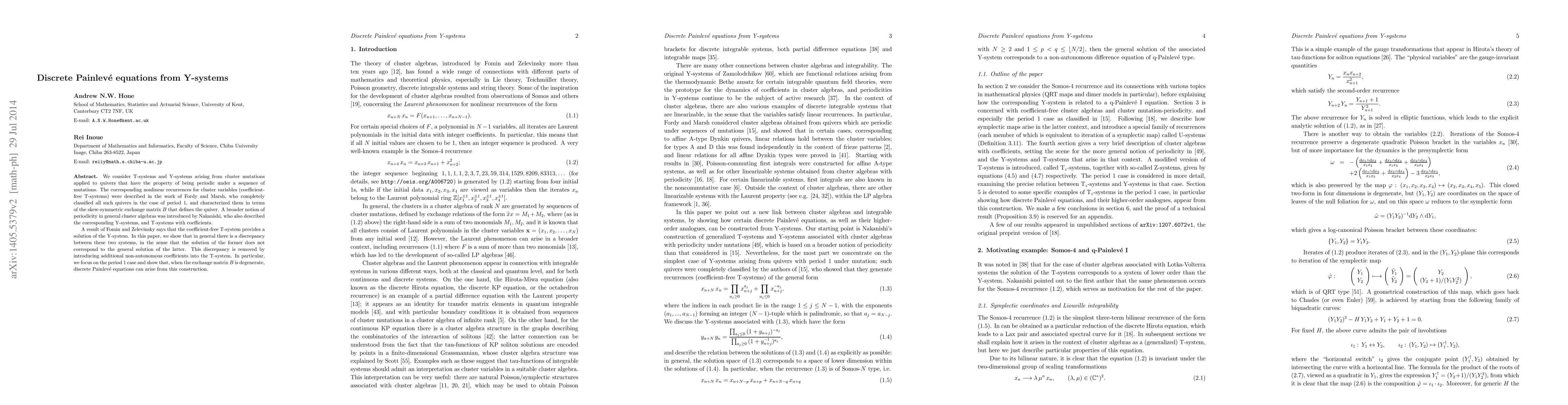 Researchers show that discrete Painlevé equations can arise from cluster algebras under certain conditions, resolving a discrepancy between T-systems and Y-systems.