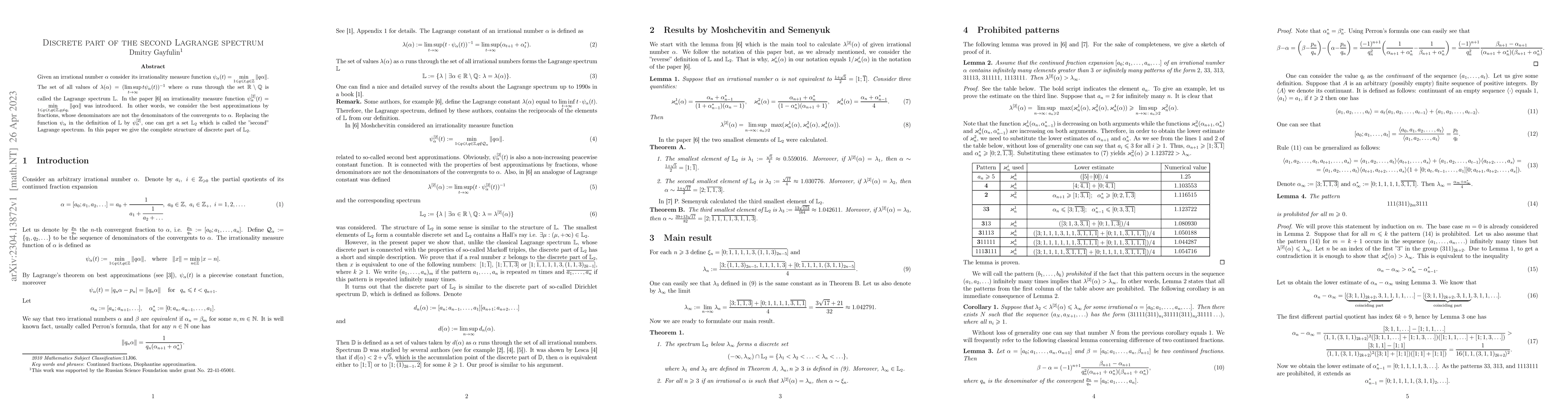 This paper investigates the discrete part of the "second" Lagrange spectrum, defined by replacing the standard irrationality measure function with a modified version that excludes the denominators of the convergents to an irrational number. The complete structure of this discrete part is determined.