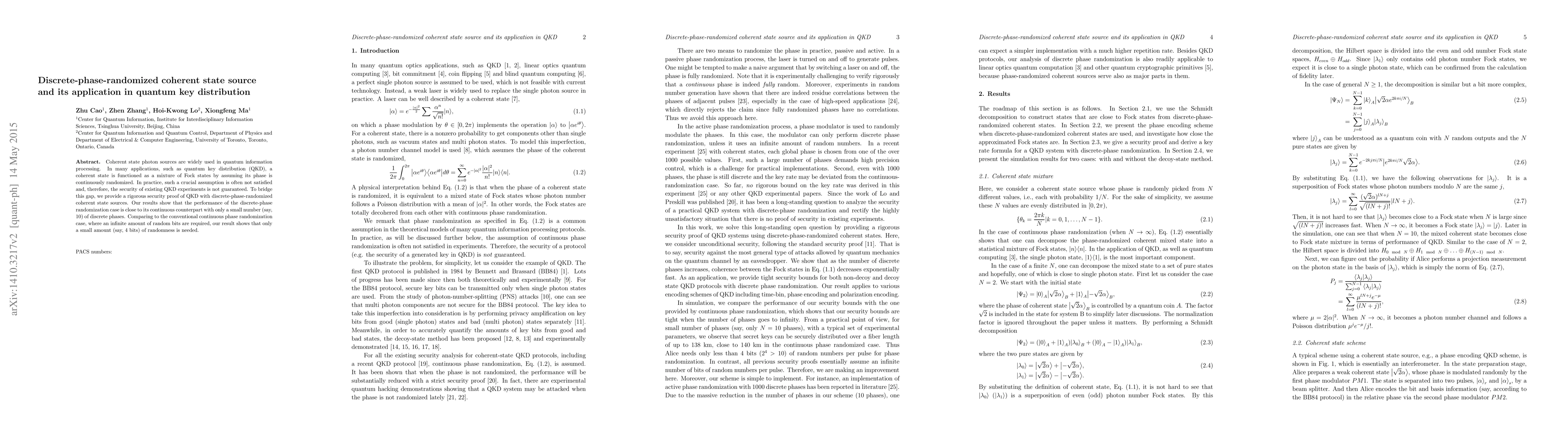 This paper presents a secure quantum key distribution (QKD) method using discrete-phase-randomized coherent state sources, proving its security and demonstrating that it performs nearly as well as continuous phase randomization with significantly fewer random bits required.