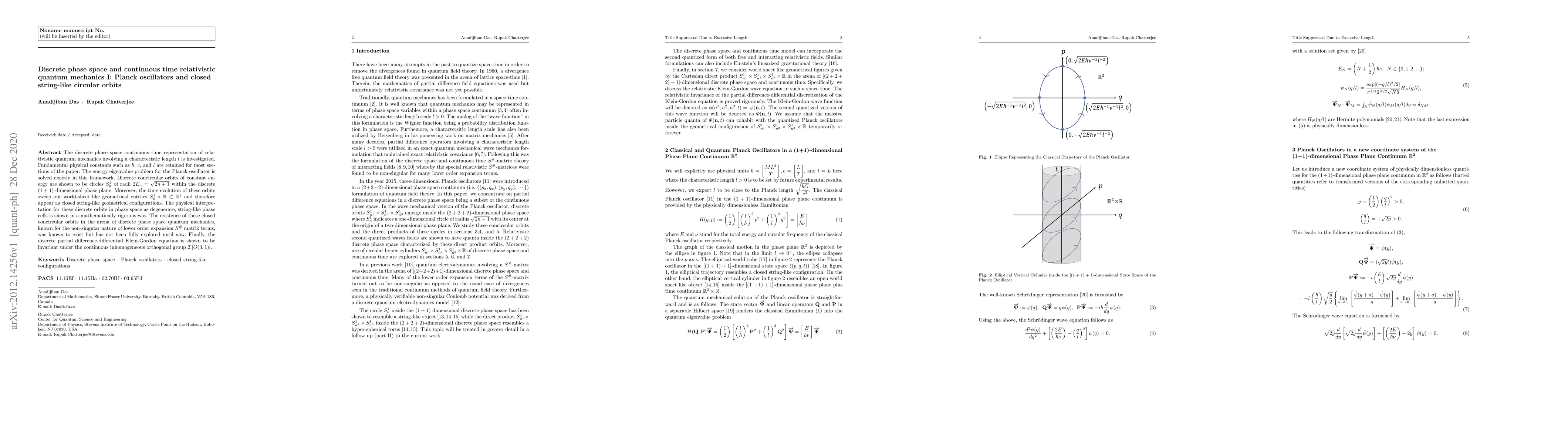 This paper explores relativistic quantum mechanics in a discrete phase space with continuous time, focusing on Planck oscillators and closed string-like orbits. It solves the energy eigenvalue problem exactly, revealing discrete concircular orbits that form closed string-like geometrical configurations in a (1 + 1)-dimensional phase plane.