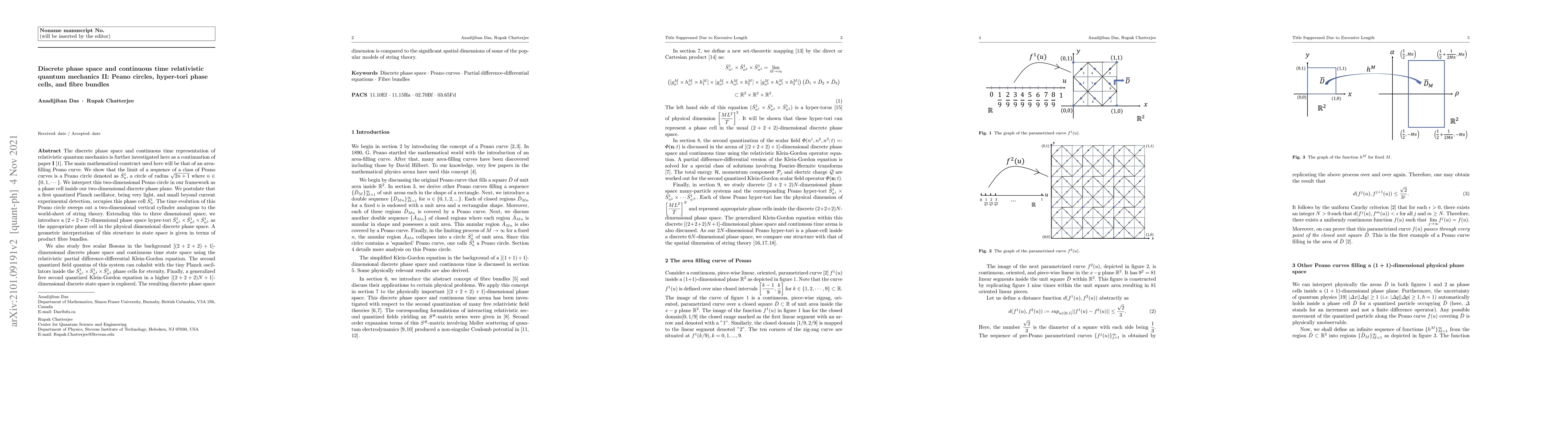 This paper extends the study of relativistic quantum mechanics in a discrete phase space and continuous time, employing Peano curves to construct phase cells. It introduces Peano circles and hyper-tori as phase cells for Planck oscillators and free scalar Bosons, respectively, and explores their geometric interpretation through fibre bundles and the Klein-Gordon equation in higher-dimensional discrete state spaces.