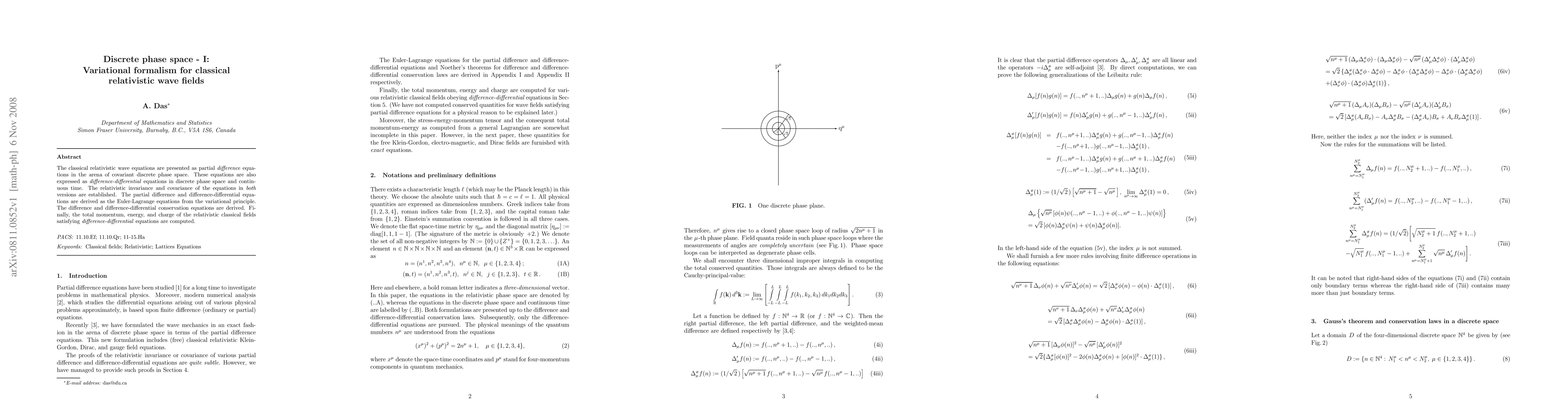 This paper introduces classical relativistic wave equations as partial difference equations in covariant discrete phase space, establishing their relativistic invariance and covariance. The equations are derived from the variational principle and include conservation laws, with total momentum, energy, and charge computed for the fields.
