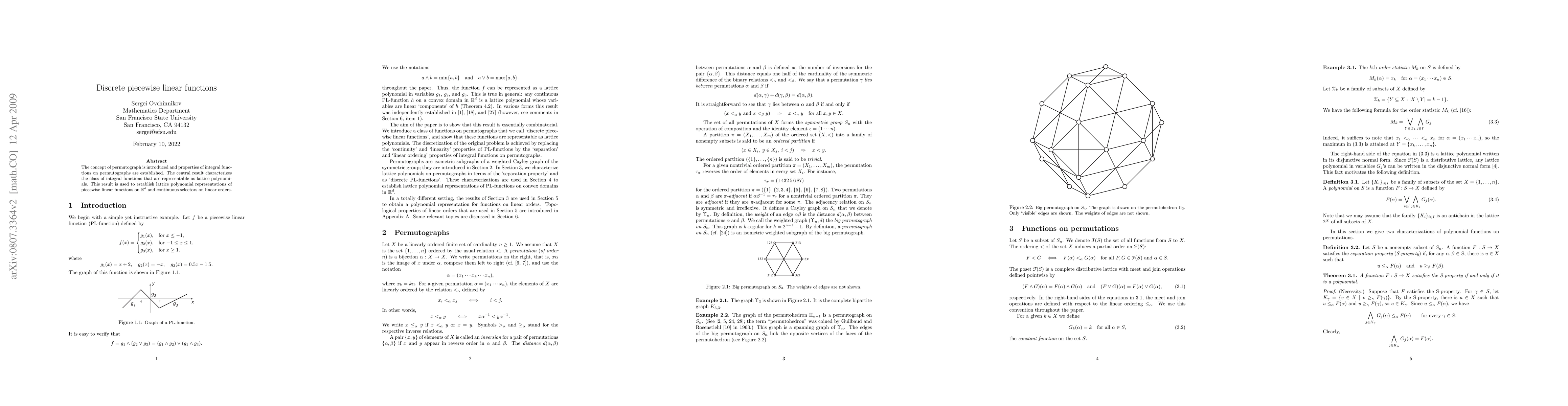 The concept of permutograph is introduced and properties of integral functions on permutographs are established. The central result characterizes the class of integral functions that are representable as lattice polynomials. This result is used to establish lattice polynomial representations of piecewise linear functions on convex domains and continuous selectors on linear orders.
