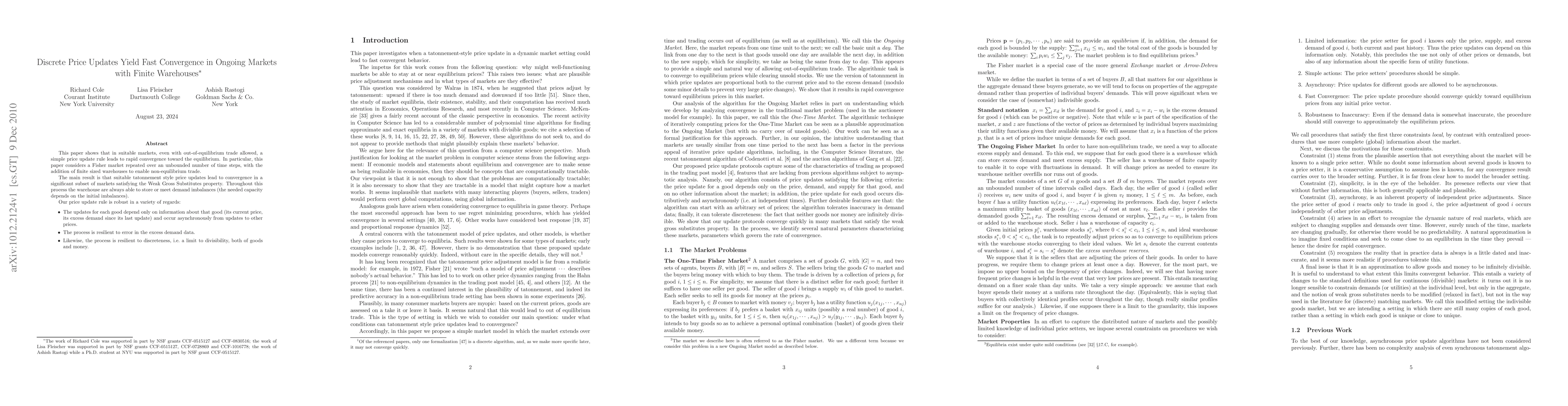 This paper demonstrates that discrete price updates in ongoing markets with finite warehouses lead to rapid convergence toward equilibrium, particularly in markets with the Weak Gross Substitutes property. The proposed tatonnement style updates are robust, resilient to errors, and can handle discreteness in goods and money.