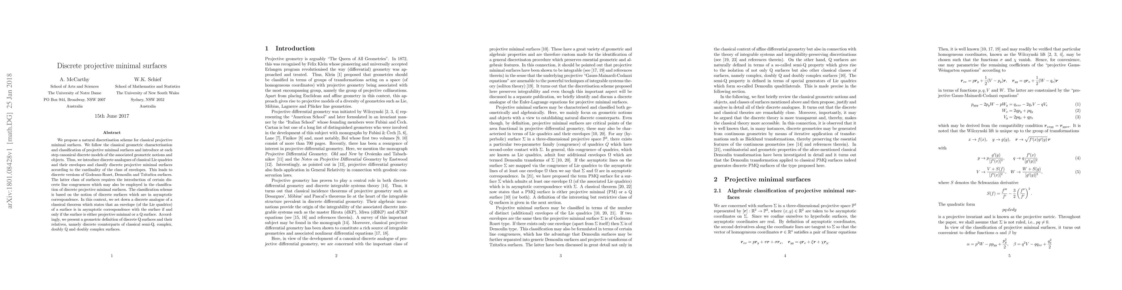 This paper proposes a discretisation scheme for projective minimal surfaces, introducing discrete analogues of classical geometric objects and classifying discrete versions of Godeaux-Rozet, Demoulin, and Tzitzeica surfaces based on the cardinality of their envelopes. The classification leverages discrete line congruences and a discrete analogue of a classical theorem relating envelopes to projective minimal surfaces.