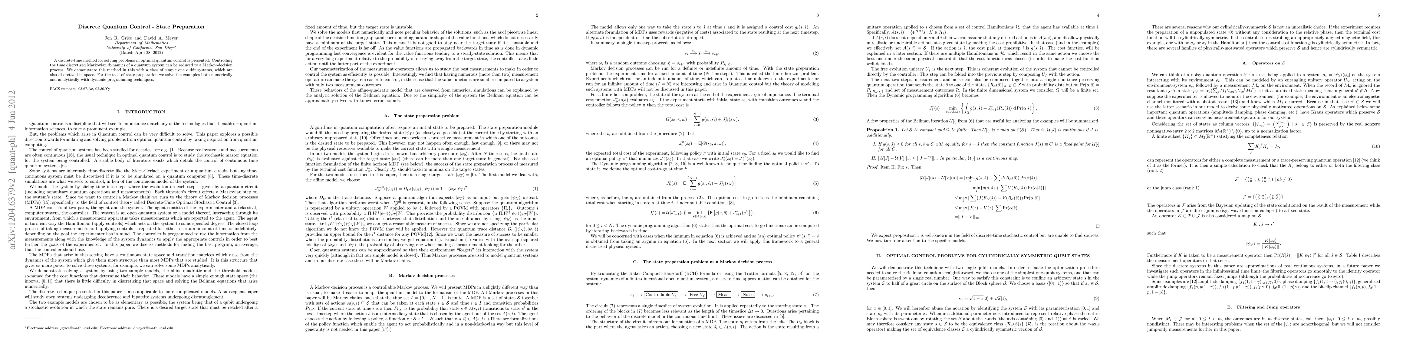 This paper introduces a discrete-time approach for optimal quantum control, framing the problem as a Markov-decision process. It applies this method to one qubit systems for state preparation, solving examples both numerically and analytically using dynamic programming techniques.