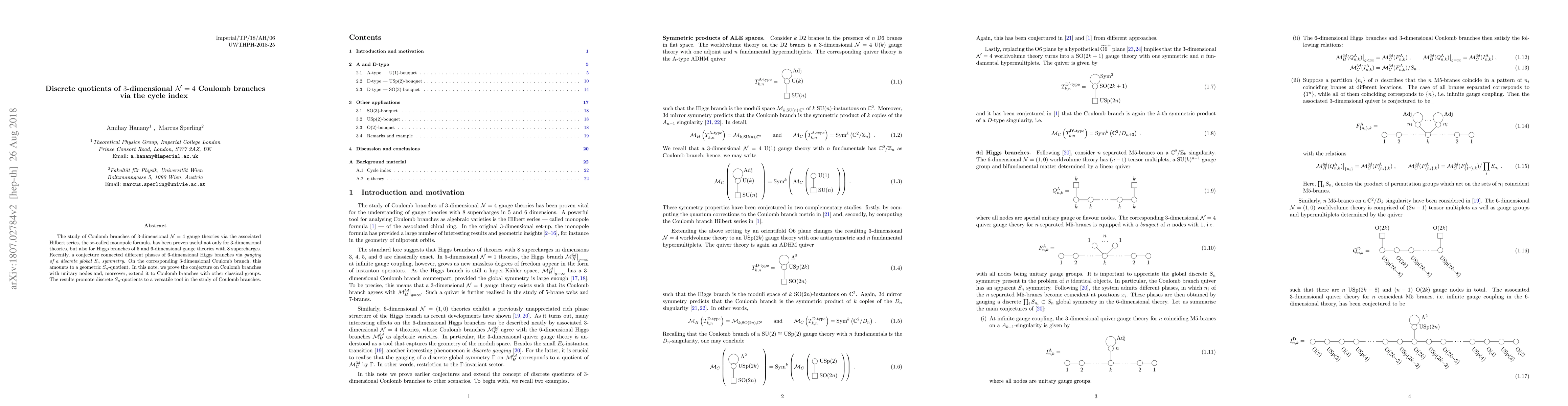 This paper proves a conjecture linking discrete $S_n$ symmetries in 3-dimensional N=4 gauge theories' Coulomb branches to geometric $S_n$-quotients, extending the findings to other classical groups and establishing discrete quotients as a valuable tool for studying such branches.