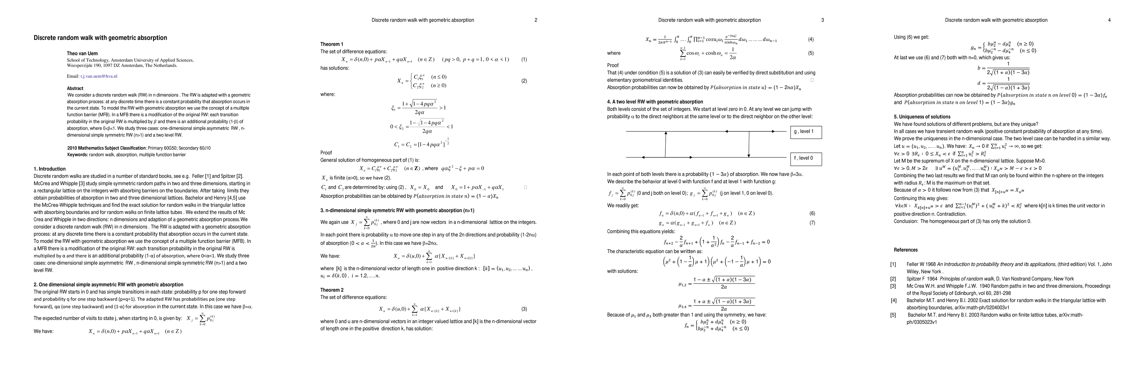 We consider a discrete random walk (RW) in n dimensions . The RW is adapted with a geometric absorption process: at any discrete time there is a constant probability that absorption occurs in the current state. To model the RW with geometric absorption we use the concept of a multiple function barrier (MFB). In a MFB there is a modification of the original RW: each transition probability in the original RW is multiplied by {\beta} and there is an additional probability (1-{\beta}) of absorption, where 0<{\beta}<1. We study three cases: one-dimensional simple asymmetric RW, n-dimensional simple symmetric RW (n>1) and a two level RW.