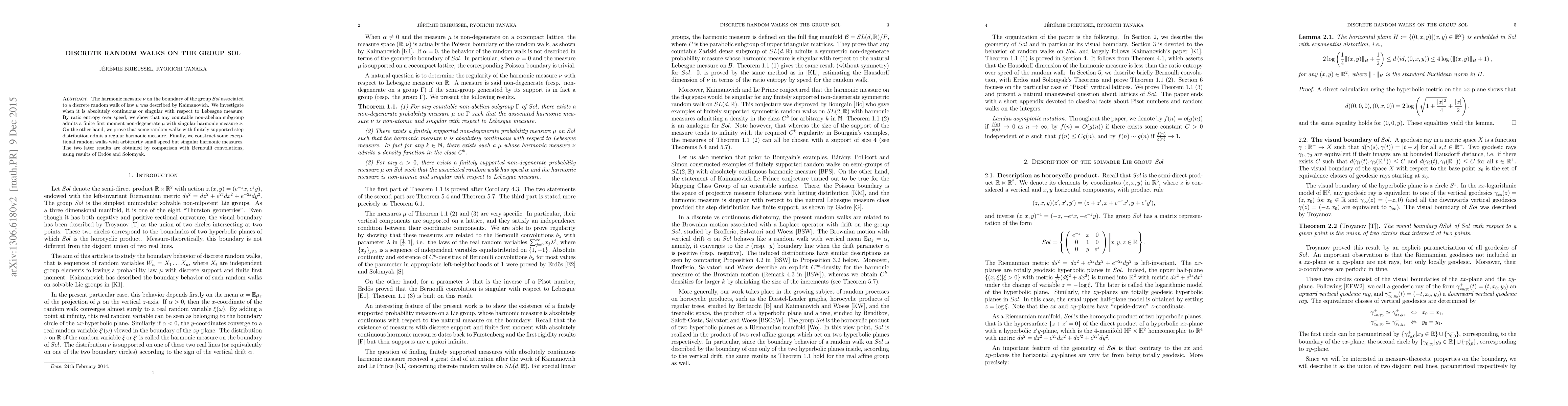 This paper investigates the harmonic measure $\nu$ on the boundary of the non-abelian group $Sol$ associated with discrete random walks. It demonstrates that certain non-abelian subgroups allow for random walks with singular harmonic measures, while others can have regular harmonic measures, with both results supported by comparisons to Bernoulli convolutions.