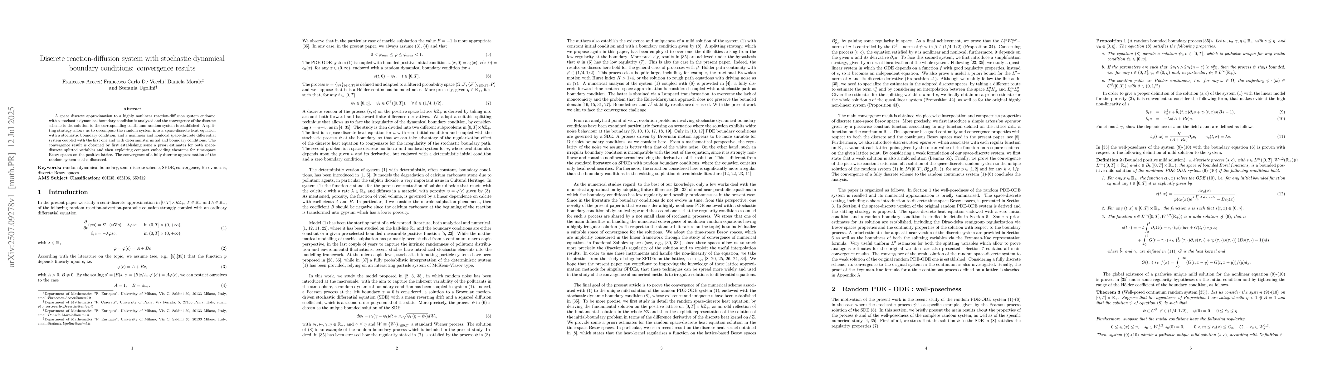 A space discrete approximation to a highly nonlinear reaction-diffusion system endowed with a stochastic dynamical boundary condition is analyzed and the convergence of the discrete scheme to the solution to the corresponding continuum random system is established. A splitting strategy allows us to decompose the random system into a space-discrete heat equation with a stochastic boundary condition, and a nonlinear and nonlocal space-discrete differential system coupled with the first one and with deterministic initial and boundary conditions. The convergence result is obtained by first establishing some a priori estimates for both space-discrete splitted variables and then exploiting compact embedding theorems for time-space Besov spaces on the positive lattice. The convergence of a fully discrete approximation of the random system is also discussed.