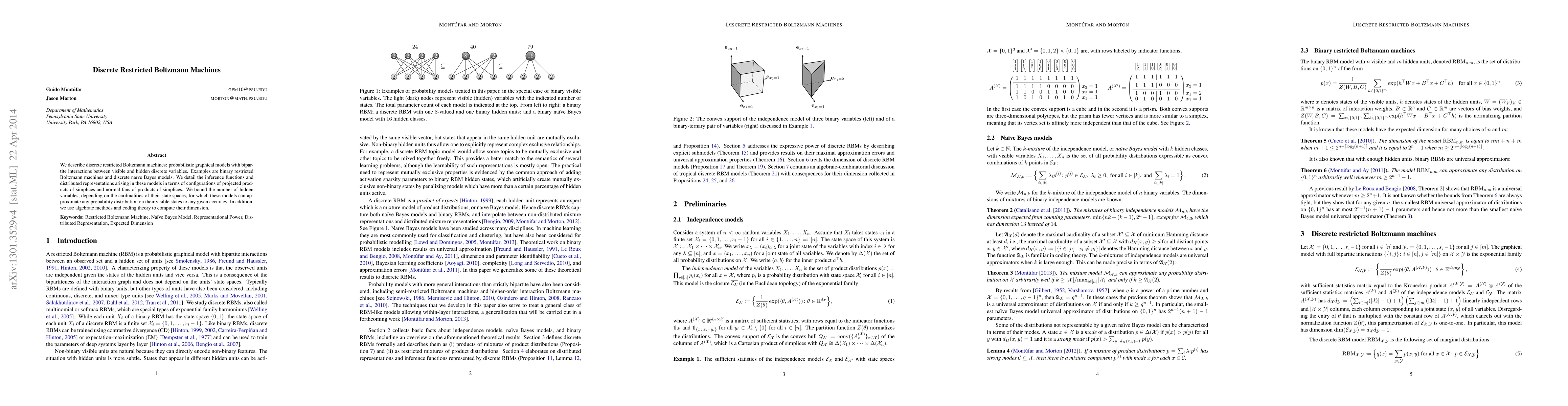 We describe discrete restricted Boltzmann machines: probabilistic graphical models with bipartite interactions between visible and hidden discrete variables. Examples are binary restricted Boltzmann machines and discrete naive Bayes models. We detail the inference functions and distributed representations arising in these models in terms of configurations of projected products of simplices and normal fans of products of simplices. We bound the number of hidden variables, depending on the cardinalities of their state spaces, for which these models can approximate any probability distribution on their visible states to any given accuracy. In addition, we use algebraic methods and coding theory to compute their dimension.