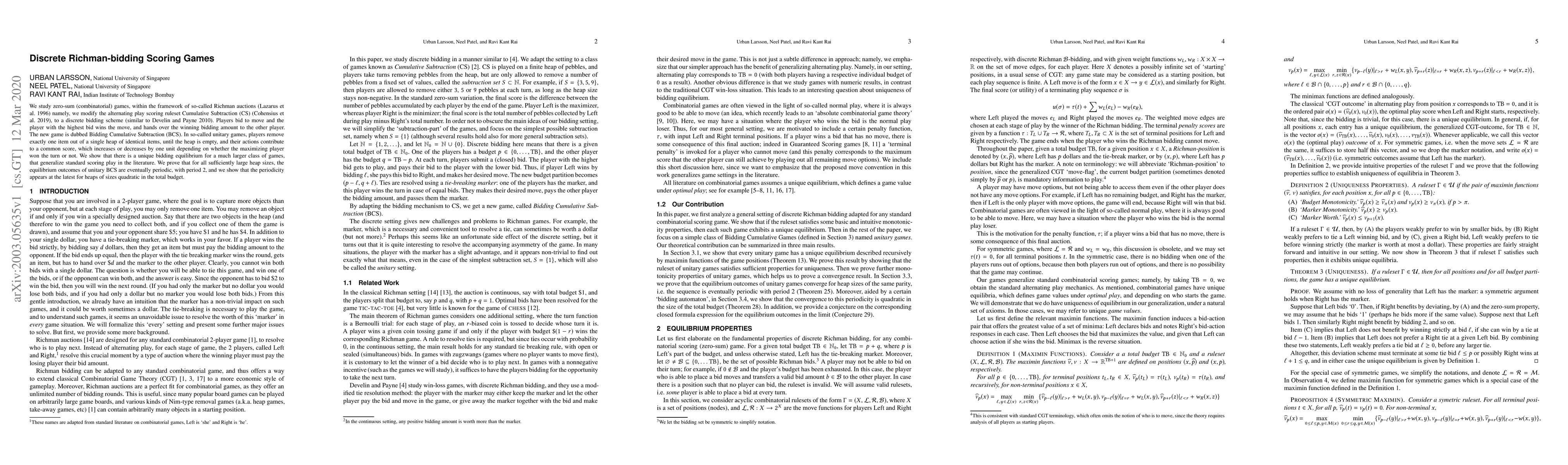 We study zero-sum (combinatorial) games, within the framework of so-called Richman auctions (Lazarus et al. 1996) namely, we modify the alternating play scoring ruleset Cumulative Subtraction (CS) (Cohensius et al. 2019), to a discrete bidding scheme (similar to Develin and Payne 2010). Players bid to move and the player with the highest bid wins the move, and hands over the winning bidding amount to the other player. The new game is dubbed Bidding Cumulative Subtraction (BCS). In so-called unitary games, players remove exactly one item out of a single heap of identical items, until the heap is empty, and their actions contribute to a common score, which increases or decreases by one unit depending on whether the maximizing player won the turn or not. We show that there is a unique bidding equilibrium for a much larger class of games, that generalize standard scoring play in the literature. We prove that for all sufficiently large heap sizes, the equilibrium outcomes of unitary BCS are eventually periodic, with period 2, and we show that the periodicity appears at the latest for heaps of sizes quadratic in the total budget.