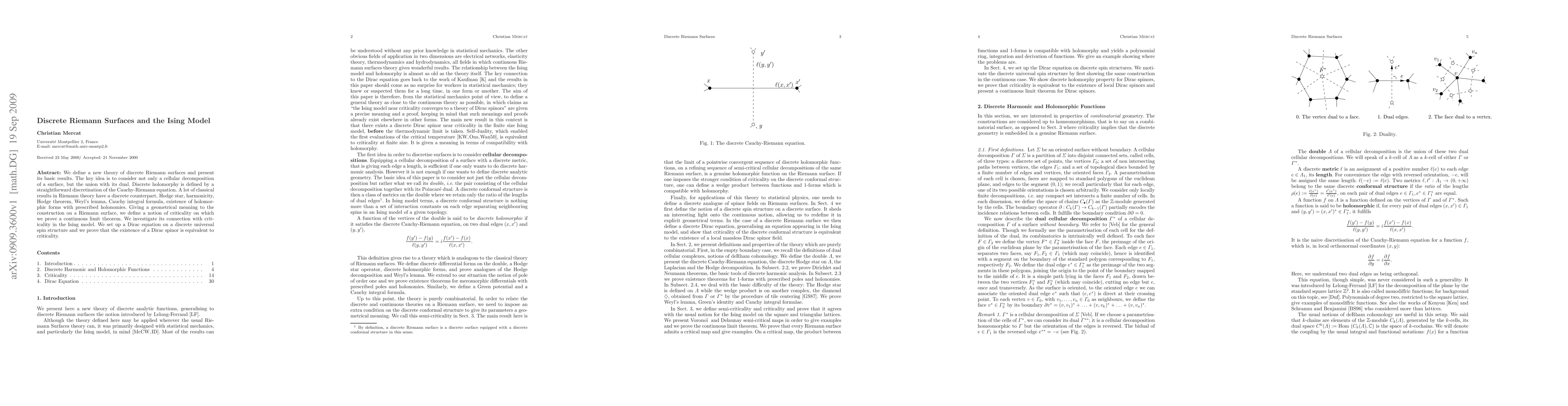 We define a new theory of discrete Riemann surfaces and present its basic results. The key idea is to consider not only a cellular decomposition of a surface, but the union with its dual. Discrete holomorphy is defined by a straightforward discretisation of the Cauchy-Riemann equation. A lot of classical results in Riemann theory have a discrete counterpart, Hodge star, harmonicity, Hodge theorem, Weyl's lemma, Cauchy integral formula, existence of holomorphic forms with prescribed holonomies. Giving a geometrical meaning to the construction on a Riemann surface, we define a notion of criticality on which we prove a continuous limit theorem. We investigate its connection with criticality in the Ising model. We set up a Dirac equation on a discrete universal spin structure and we prove that the existence of a Dirac spinor is equivalent to criticality.