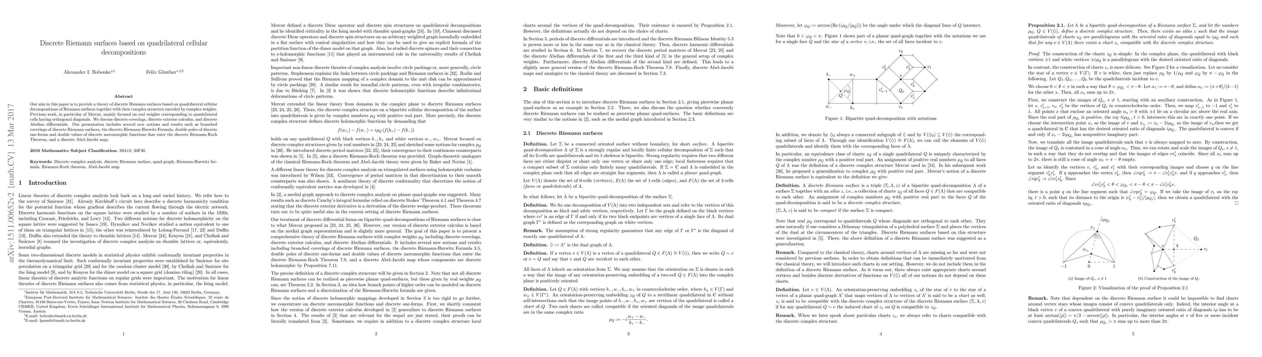This paper develops a theory for discrete Riemann surfaces using quadrilateral cellular decompositions, introducing complex weights for encoding complex structures. It extends previous work by discussing discrete coverings, exterior calculus, and Abelian integrals, presenting novel concepts like the discrete Riemann-Hurwitz Formula and a discrete Abel-Jacobi map.