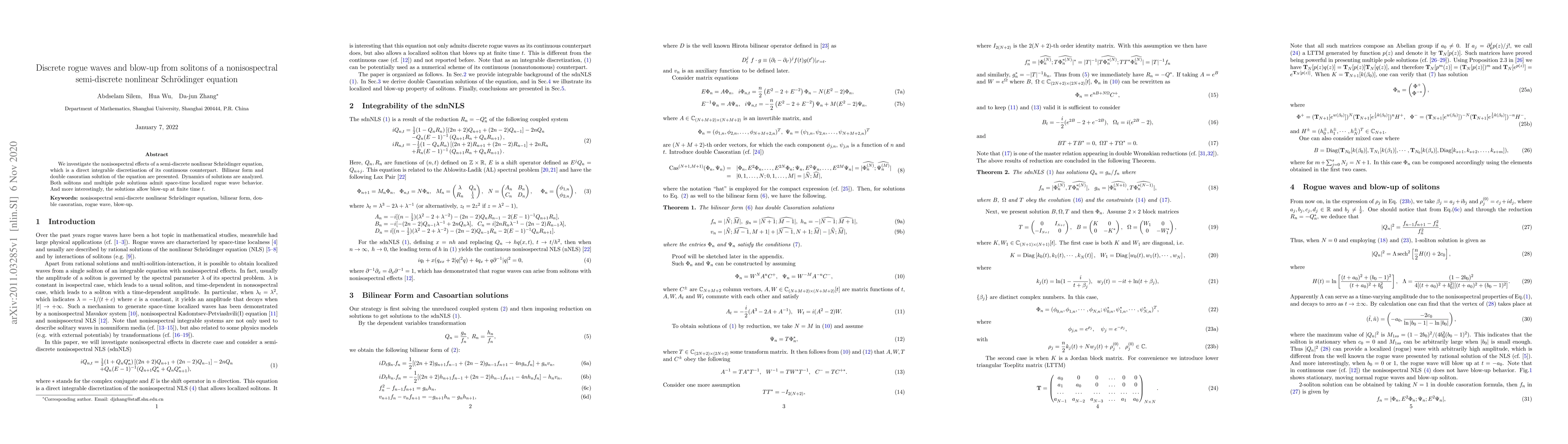This research paper investigates a semi-discrete nonlinear Schrödinger equation, finding that it can produce discrete rogue waves and blow-up at finite time, with both solitons and multiple pole solutions exhibiting localized behavior.