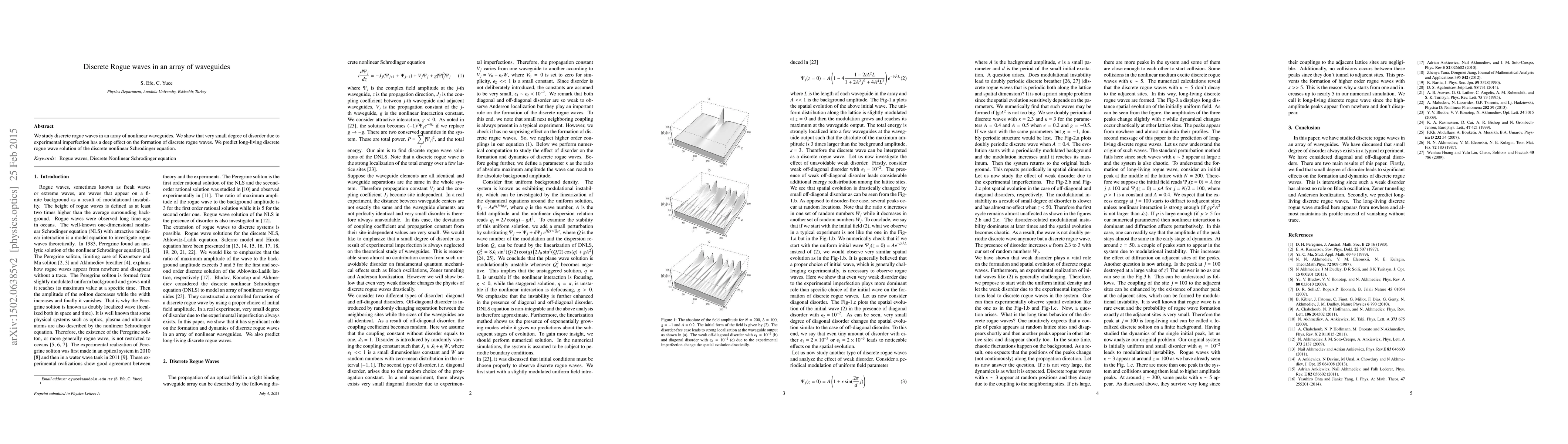The study investigates discrete rogue waves in an array of nonlinear waveguides using the discrete nonlinear Schrödinger equation (DNLS). It considers both off-diagonal and diagonal disorders resulting from experimental imperfections.