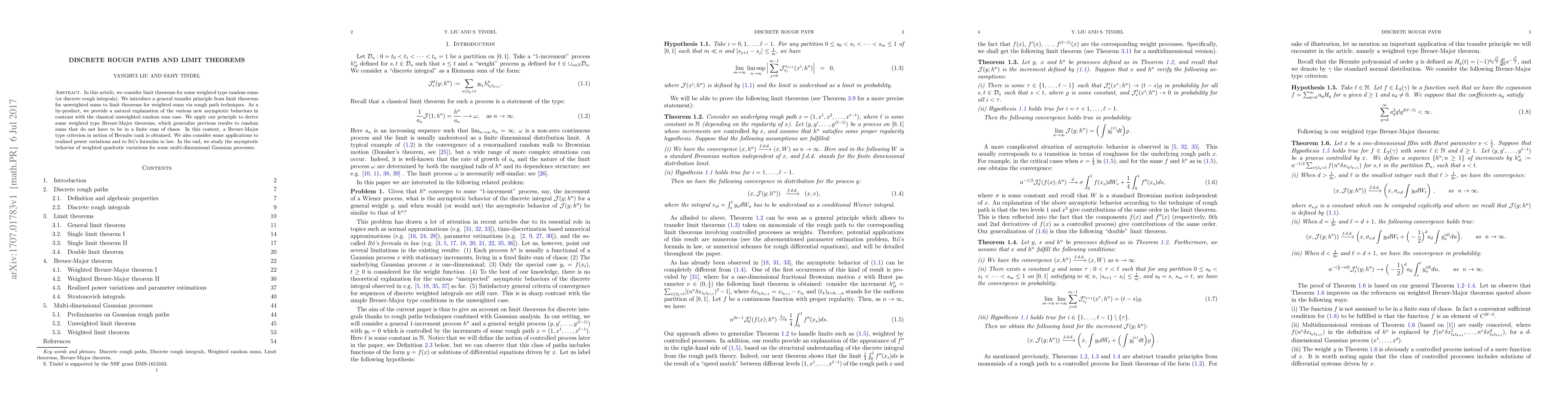This paper develops limit theorems for weighted random sums using rough path techniques, introducing a transfer principle that explains new asymptotic behaviors compared to unweighted sums. It generalizes Breuer-Major theorems and applies to realized power variations and Ito's formulas in law, concluding with an analysis of weighted quadratic variations for Gaussian processes.