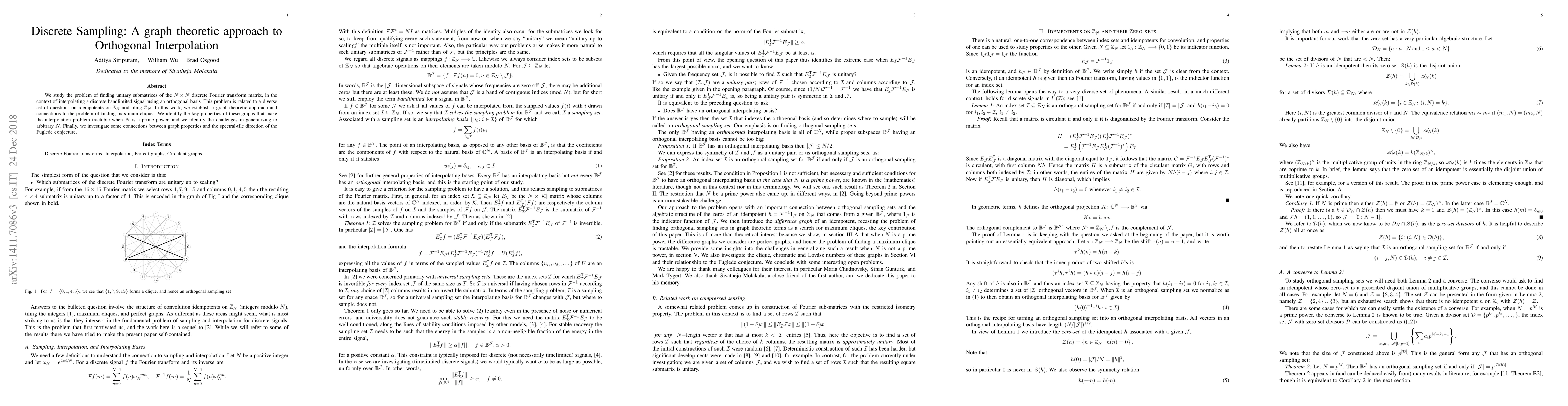 This paper explores a graph-theoretic method for finding unitary submatrices of the discrete Fourier transform matrix to interpolate bandlimited signals using an orthogonal basis. It identifies key graph properties that simplify the problem when $N$ is a prime power, while also discussing challenges in extending these findings to arbitrary $N$ and connections to the Fuglede conjecture.