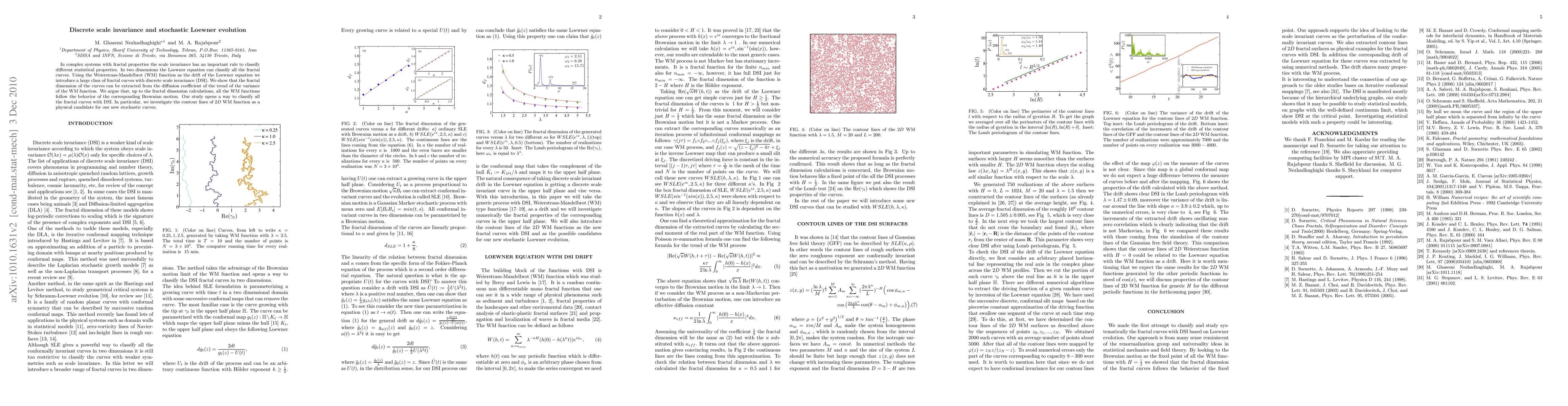 In complex systems with fractal properties the scale invariance has an important rule to classify different statistical properties. In two dimensions the Loewner equation can classify all the fractal curves. Using the Weierstrass-Mandelbrot (WM) function as the drift of the Loewner equation we introduce a large class of fractal curves with discrete scale invariance (DSI). We show that the fractal dimension of the curves can be extracted from the diffusion coefficient of the trend of the variance of the WM function. We argue that, up to the fractal dimension calculations, all the WM functions follow the behavior of the corresponding Brownian motion. Our study opens a way to classify all the fractal curves with DSI. In particular, we investigate the contour lines of 2D WM function as a physical candidate for our new stochastic curves.