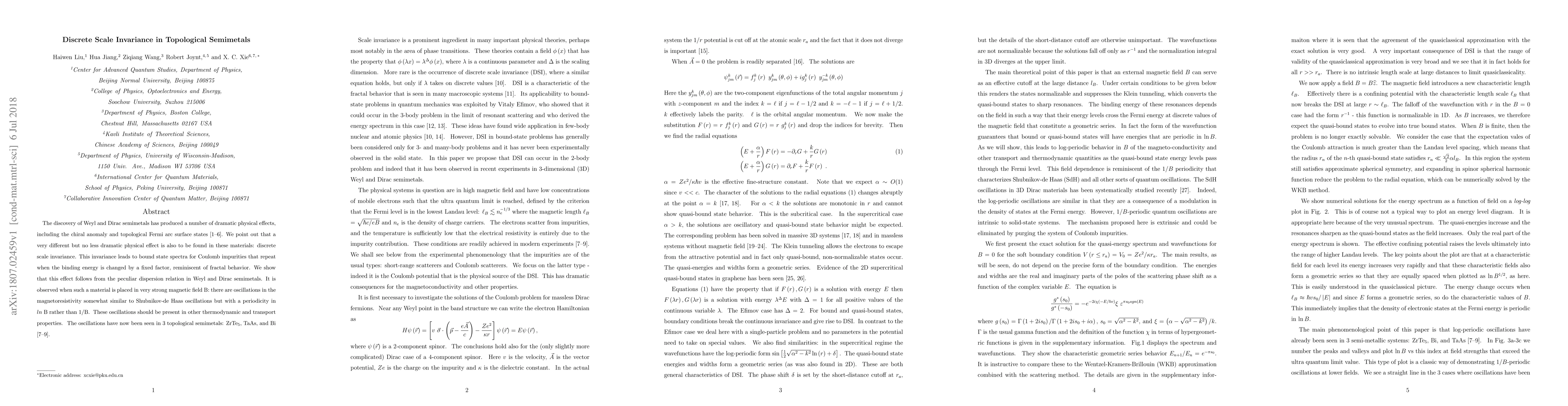 The discovery of Weyl and Dirac semimetals has produced a number of dramatic physical effects, including the chiral anomaly and topological Fermi arc surface states. We point out that a very different but no less dramatic physical effect is also to be found in these materials: discrete scale invariance. This invariance leads to bound state spectra for Coulomb impurities that repeat when the binding energy is changed by a fixed factor, reminiscent of fractal behavior. We show that this effect follows from the peculiar dispersion relation in Weyl and Dirac semimetals. It is observed when such a material is placed in very strong magnetic field B: there are oscillations in the magnetoresistivity somewhat similar to Shubnikov-de Haas oscillations but with a periodicity in ln B rather than 1/B. These oscillations should be present in other thermodynamic and transport properties. The oscillations have now been seen in three topological semimetals: ZrTe$_{5}$, TaAs, and Bi.