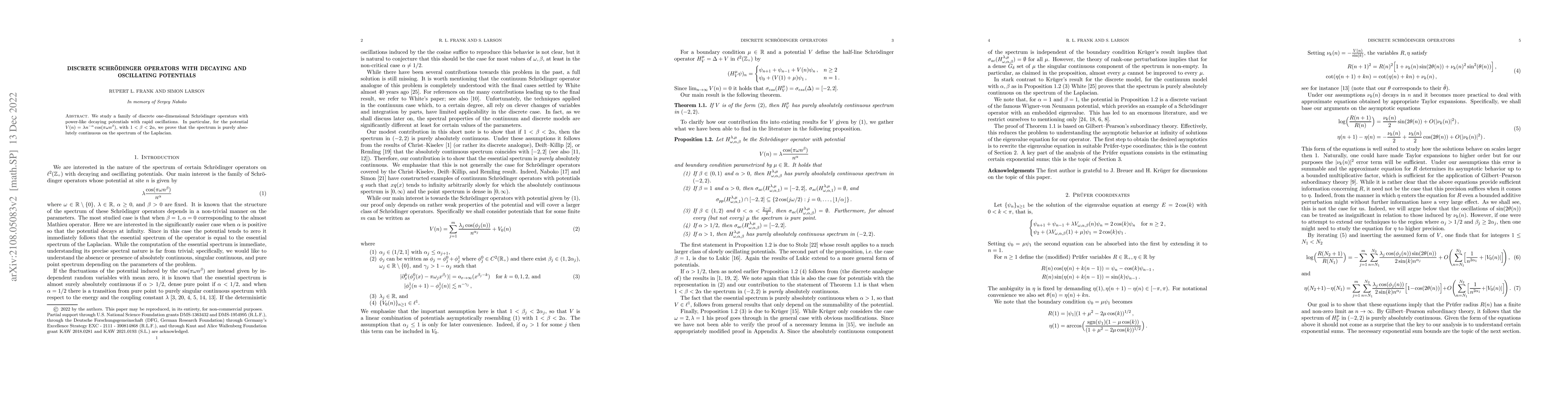 This paper investigates discrete one-dimensional Schrödinger operators with decaying and oscillating potentials, proving that the spectrum is purely absolutely continuous for potentials of the form $V(n)=\lambda n^{-\alpha}\cos(\pi \omega n^\beta)$ under the condition $1<\beta<2\alpha$.