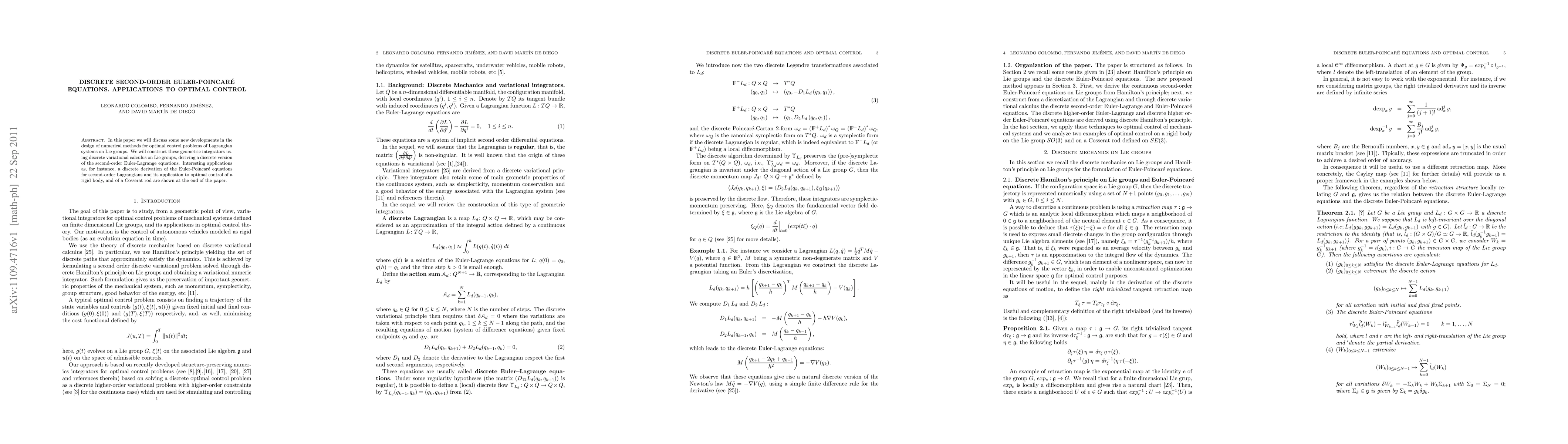 In this paper we will discuss some new developments in the design of numerical methods for optimal control problems of Lagrangian systems on Lie groups. We will construct these geometric integrators using discrete variational calculus on Lie groups, deriving a discrete version of the second-order Euler-Lagrange equations. Interesting applications as, for instance, a discrete derivation of the Euler-Poincar\'e equations for second-order Lagrangians and its application to optimal control of a rigid body, and of a Cosserat rod are shown at the end of the paper.
