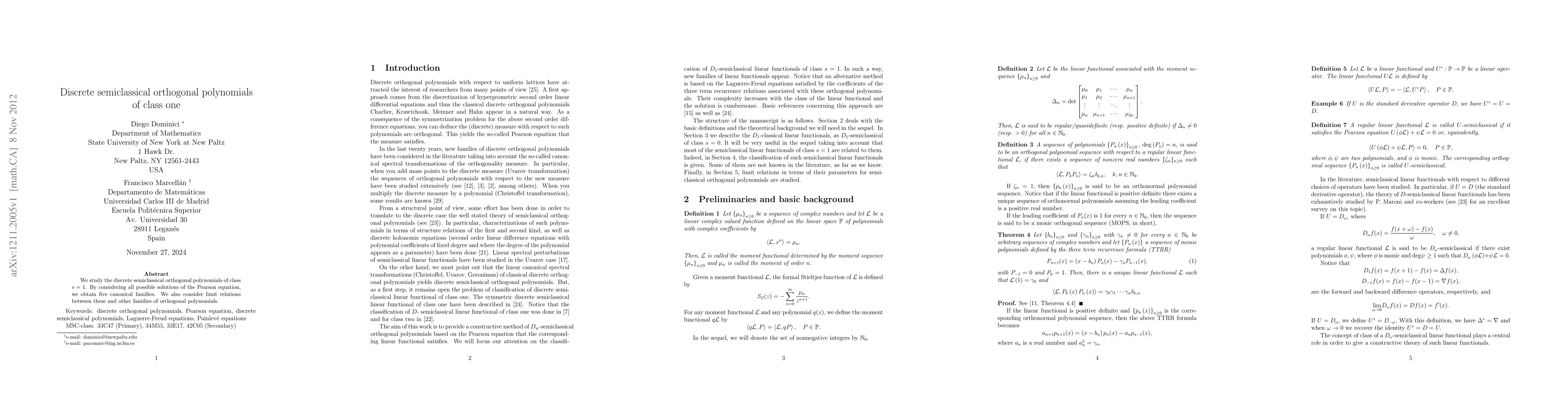 Summary: This paper investigates discrete semiclassical orthogonal polynomials of class one, identifying five canonical families through solutions of the Pearson equation, and explores their limit relations with other orthogonal polynomial families.