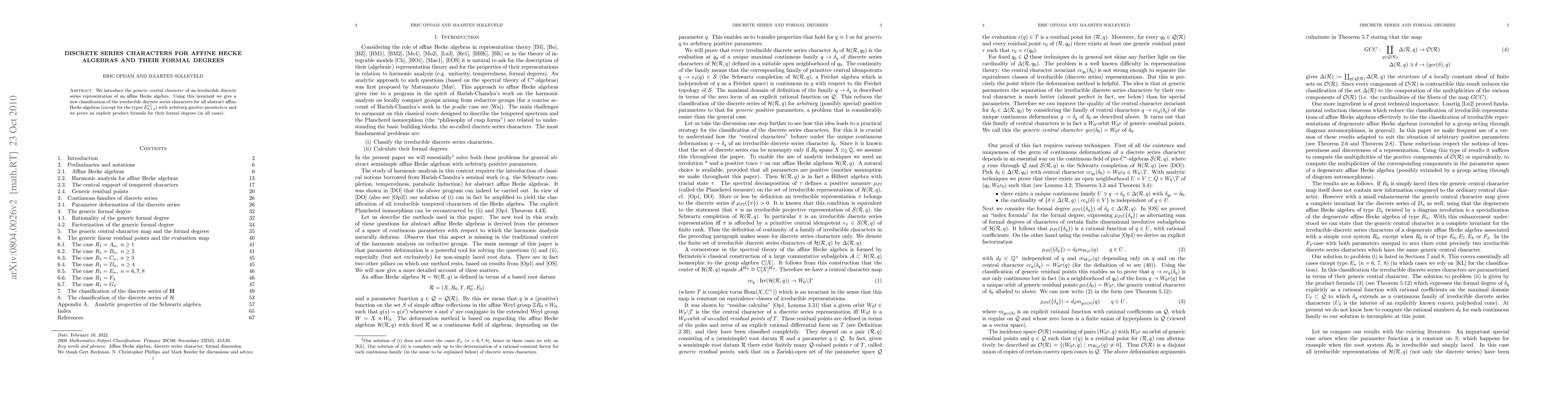 We introduce the generic central character of an irreducible discrete series representation of an affine Hecke algebra. Using this invariant we give a new classification of the irreducible discrete series characters for all abstract affine Hecke algebras (except for the types E) with arbitrary positive parameters and we prove an explicit product formula for their formal degrees (in all cases).