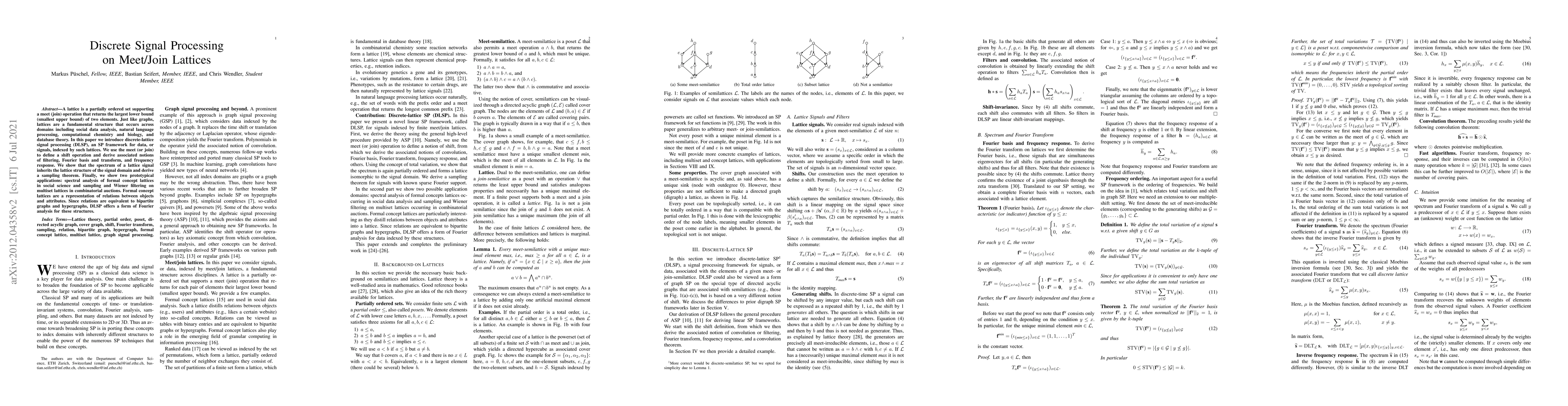 This paper introduces discrete-lattice signal processing (DLSP) for data indexed by meet/join lattices, defining a shift operation and deriving filtering, Fourier basis, and transform concepts. It demonstrates applications in social science and combinatorial auctions, offering Fourier analysis for bipartite graphs and hypergraphs.