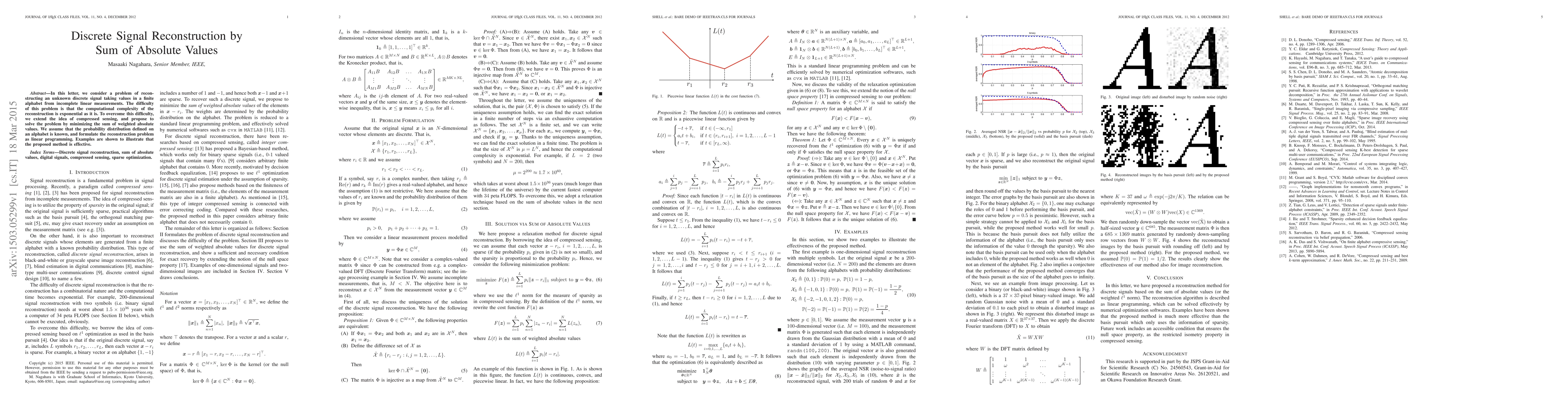 In this letter, we consider a problem of reconstructing an unknown discrete signal taking values in a finite alphabet from incomplete linear measurements. The difficulty of this problem is that the computational complexity of the reconstruction is exponential as it is. To overcome this difficulty, we extend the idea of compressed sensing, and propose to solve the problem by minimizing the sum of weighted absolute values. We assume that the probability distribution defined on an alphabet is known, and formulate the reconstruction problem as linear programming. Examples are shown to illustrate that the proposed method is effective.