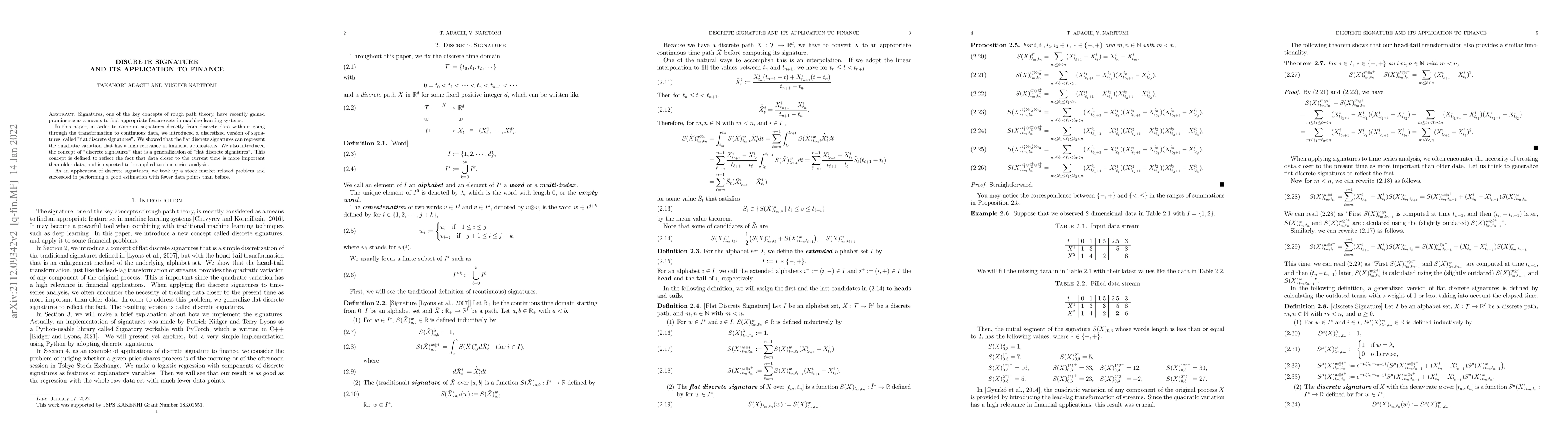 Signatures, one of the key concepts of rough path theory, have recently gained prominence as a means to find appropriate feature sets in machine learning systems. In this paper, in order to compute signatures directly from discrete data without going through the transformation to continuous data, we introduced a discretized version of signatures, called "flat discrete signatures". We showed that the flat discrete signatures can represent the quadratic variation that has a high relevance in financial applications. We also introduced the concept of "discrete signatures" that is a generalization of "flat discrete signatures". This concept is defined to reflect the fact that data closer to the current time is more important than older data, and is expected to be applied to time series analysis. As an application of discrete signatures, we took up a stock market related problem and succeeded in performing a good estimation with fewer data points than before.